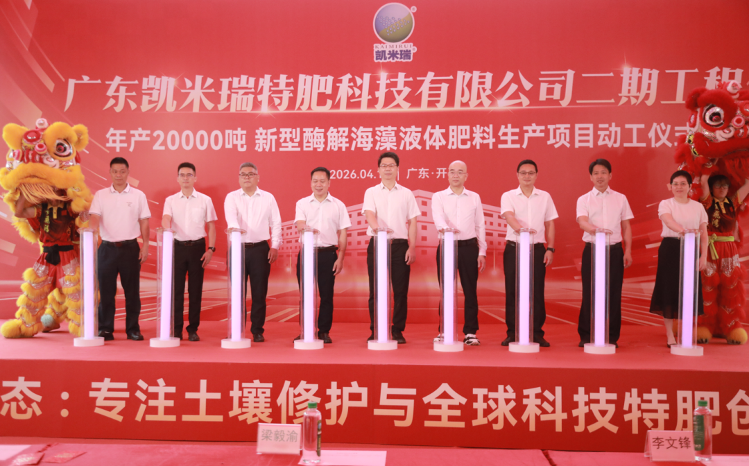 4月10日上午,廣東凱米瑞特肥科技有限公司年產20000噸新型酶解海藻液體肥料生產項目在月山鎮舉行動工儀式。項目建成后將進一步擴大企業產能,推動農業綠色升級與新型酶解技術推廣應用,助力開平農業高質量發展。開平市委副書記、政法委書記梁毅渝,瑞豐生態集團董事長陳秋雄等參加活動。