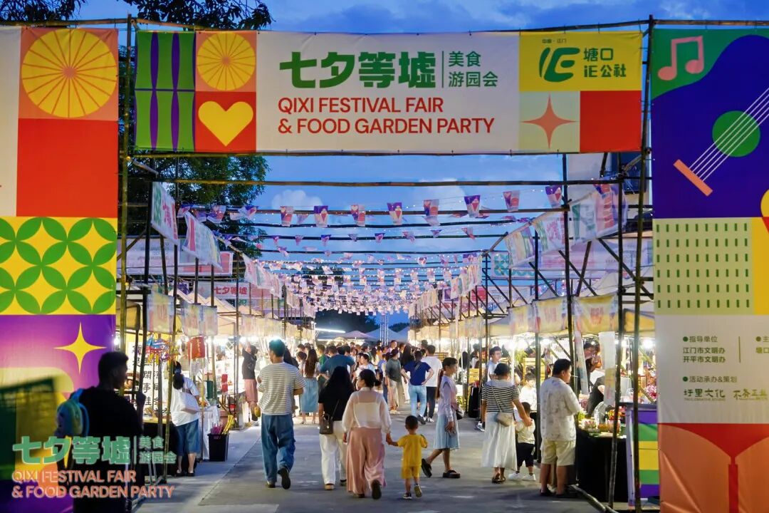 活動以江門開平當地傳統的七夕“等墟”習俗為載體,依托風貌品質提升卓有成效的塘口舊墟區域,發揮鄉村文化空間網紅打卡點的優勢和塘口IE公社青年才俊與本土創業者的資源,帶著七年沉淀的浪漫與創新,以祈福的儀式、美食的香氣、音樂的旋律、青春的活力與煙火的熱鬧,呈現濃厚的僑鄉特色傳統節日文化氛圍,共赴一場圩里夏日的浪漫七夕節。