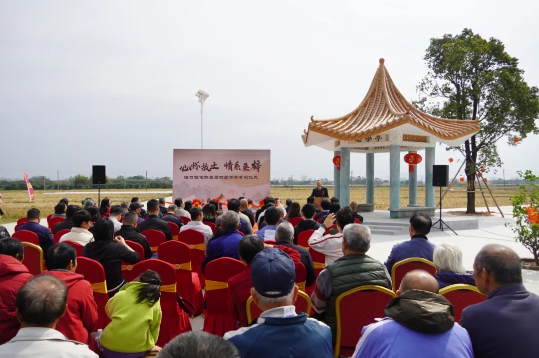 儀式上,方君學與一眾領導嘉賓為宅群桑園村君學亭建成啟用剪彩。本次落成的君學亭,黃瓦蓋頂,飛檐翹角,為村民們提供了休閑納涼、閑話家常的舒適空間,屬于宅群桑園村君學亭及村場項目的主體工程。此工程涵蓋君學亭建設、魚塘安全護欄安裝、村場硬底化等內容,目前均已建成,不僅有力提升桑園村人居環境,更成為了連接海內外游子與家鄉的情感紐帶。