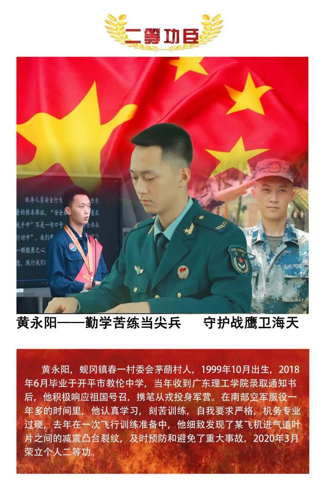 開平市2018年入伍的優秀青年黃永陽因工作表現出色,榮立二等功一次。今年剛滿20歲的黃永陽,是蜆岡鎮春一村委會茅蓢村人,入伍一年多就立下二等功,成為南部戰區空軍航空兵的小“名人”。黃永陽 是蜆岡鎮春一村委會茅蓢村人, 2019年9月,剛剛從教倫中學畢業的黃永陽雖然考上了大學,但他積極響應國家號召,懷揣著青春夢想,暫緩入學,光榮入伍,成為一名守護戰鷹的機務兵。