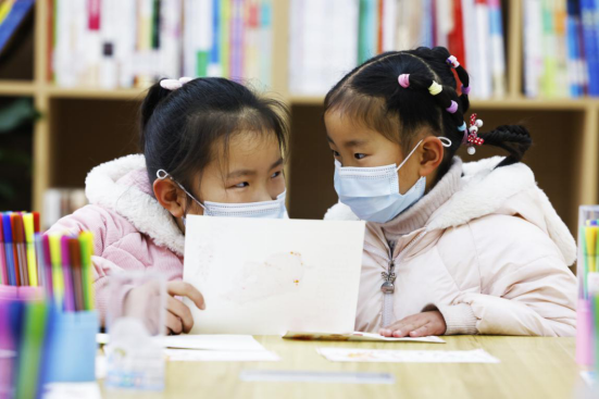 圖為2022年1月22日,在泗洪縣瑤溝鄉官塘社區新時代文明實踐站,參加愛心托管班的小朋友交流繪制的年畫。 新華社發 許昌亮/攝