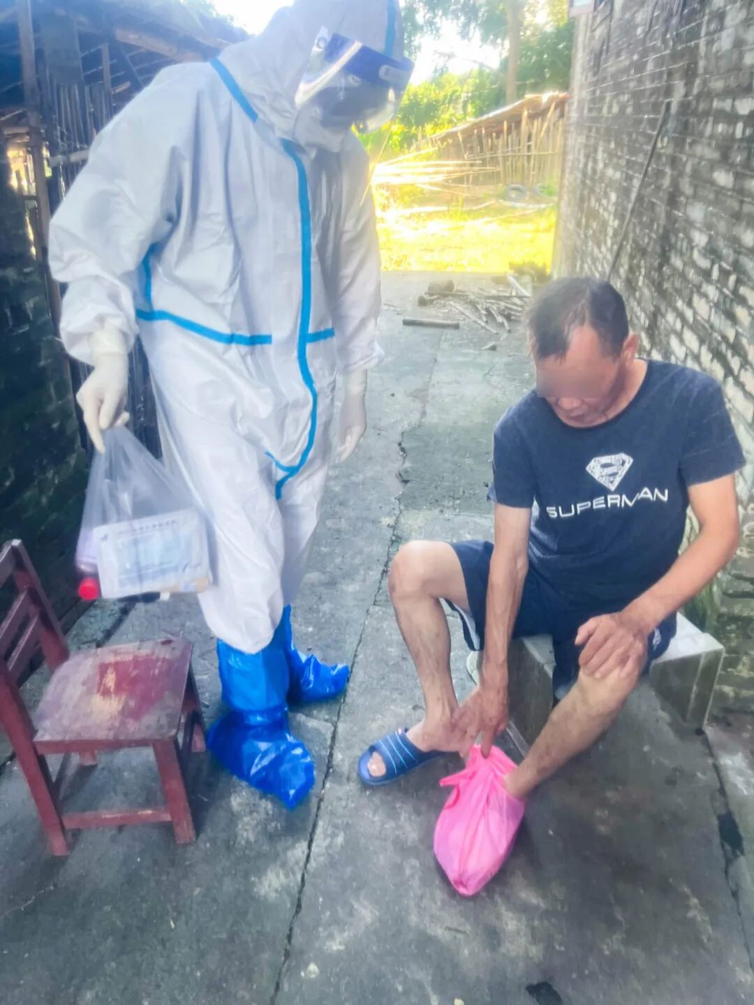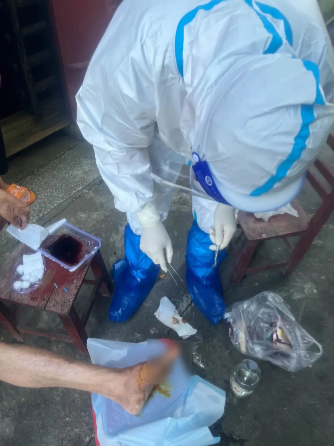 由于核酸采樣派出了大量人員,導致院內人手緊缺,為了保障群眾繼續得到良好醫療服務,市中心醫院醫務人員主動取消休假,堅守崗位,哪怕要到風險區去,也毫不猶豫。7月10日,我院急診科出車到中風險區赤坎五堡,為糖尿病足行左足第一趾截肢術后一個月的患者進行換藥。