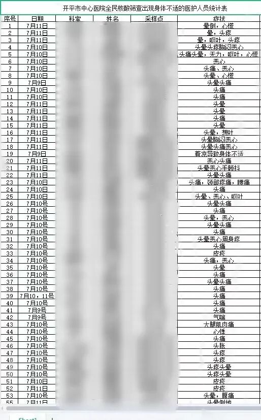 成功的背后離不開艱苦的付出和無我的奉獻,下面這張圖截取的是一部分核酸采樣身體不適醫務人員統計表。