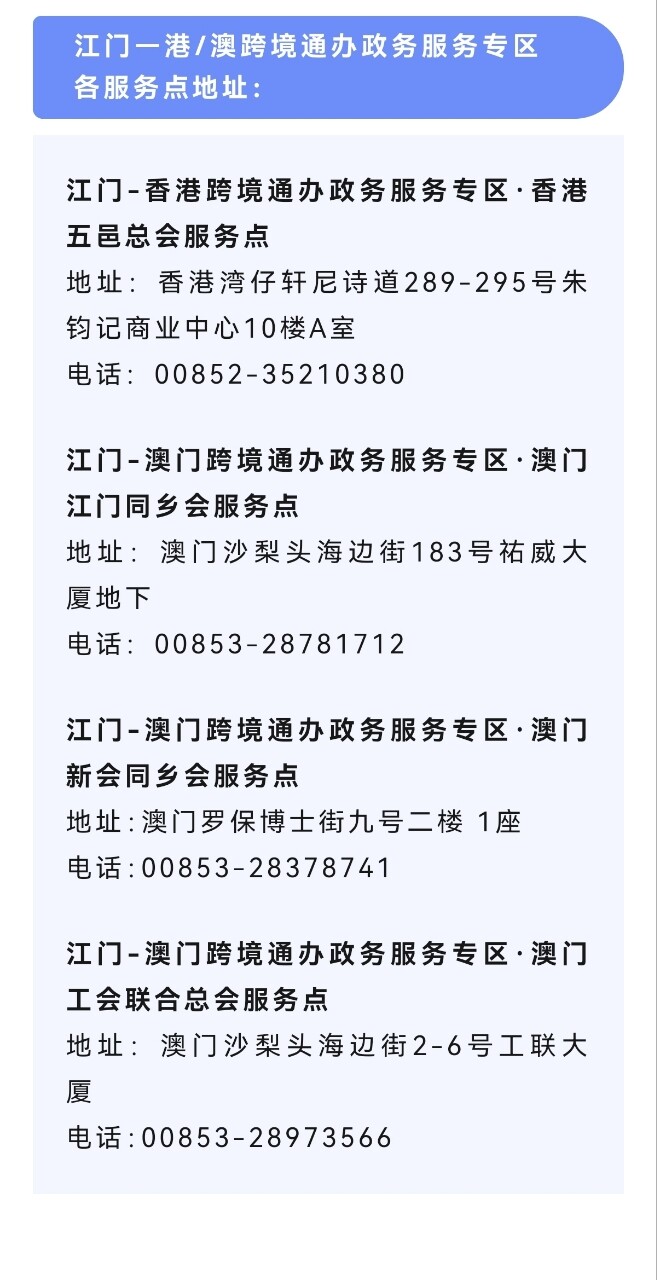 跨境通辦,開平市政府在香港、澳門均設(shè)有綜合性政務(wù)服務(wù)專區(qū),港澳地區(qū)的企業(yè)和群眾可“零出關(guān)”辦理開平市的不動(dòng)產(chǎn)、企業(yè)開辦、人才就業(yè)、稅務(wù)、社保、公積金、機(jī)動(dòng)車等高頻事項(xiàng),以及廣東省內(nèi)其他城市的高頻事項(xiàng)。市行政服務(wù)中心在服務(wù)大廳一樓設(shè)立了“江門·開平—港澳跨境通辦政務(wù)服務(wù)專區(qū)”,并配備專門的業(yè)務(wù)員,為有需要的群眾提供相關(guān)業(yè)務(wù)辦理服務(wù)??缇惩ㄞk,大大減少了港澳同胞跨境辦事的跑腿次數(shù),有效提升了辦事便捷度、體驗(yàn)度和滿意度。