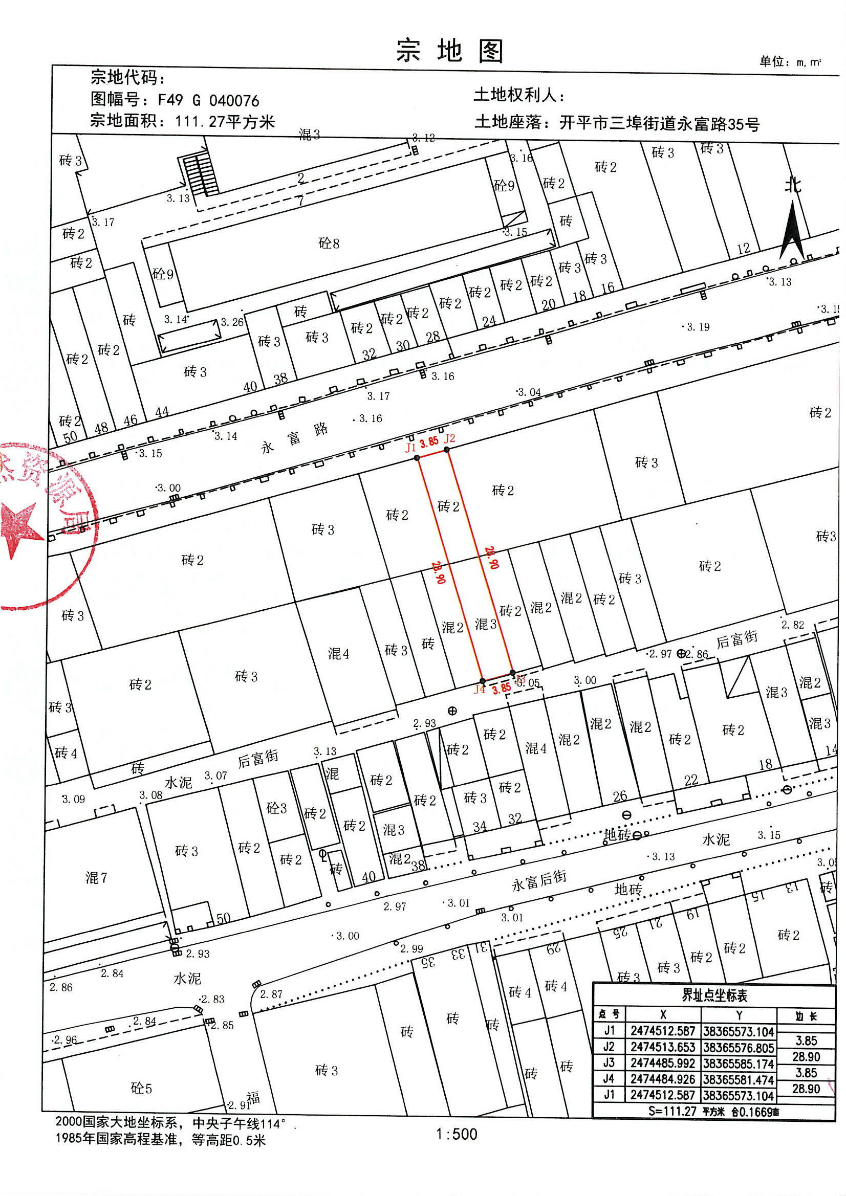 坐落在開平市新昌永富路三十五號(現編門牌:開平市三埠街道永富路35號)[開國用(1994)字第00065號]的土地使用權,重新測繪核查的土地面積111.27平方米。用地單位 何慶云的合法繼承人葉佩璇 現申請辦理不動產變更登記。若對該用地界線范圍內的用地或地上建筑物權屬有異議者,自公告之日起15個工作日內向開平市自然資源局三埠自然資源所書面提出意見。如無異議,公告期滿即給該單位辦理不動產登記有關手續。用地界線詳見附圖。
