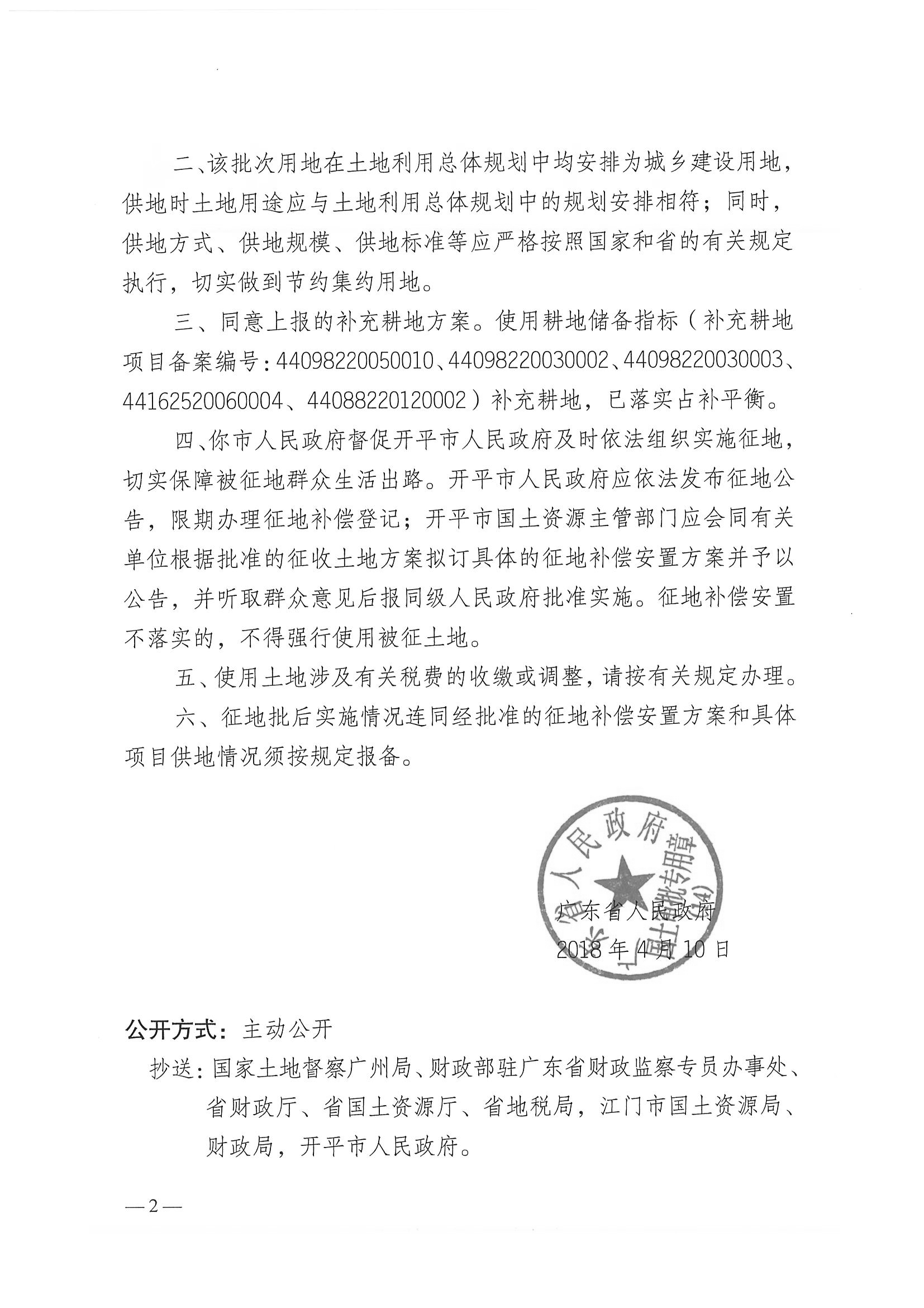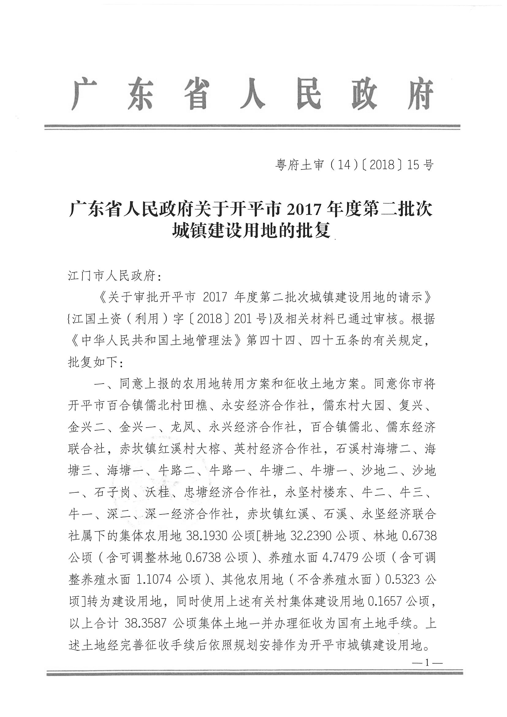 廣東省人民政府關于開平市2017年度第二批次城鎮建設用地的批復