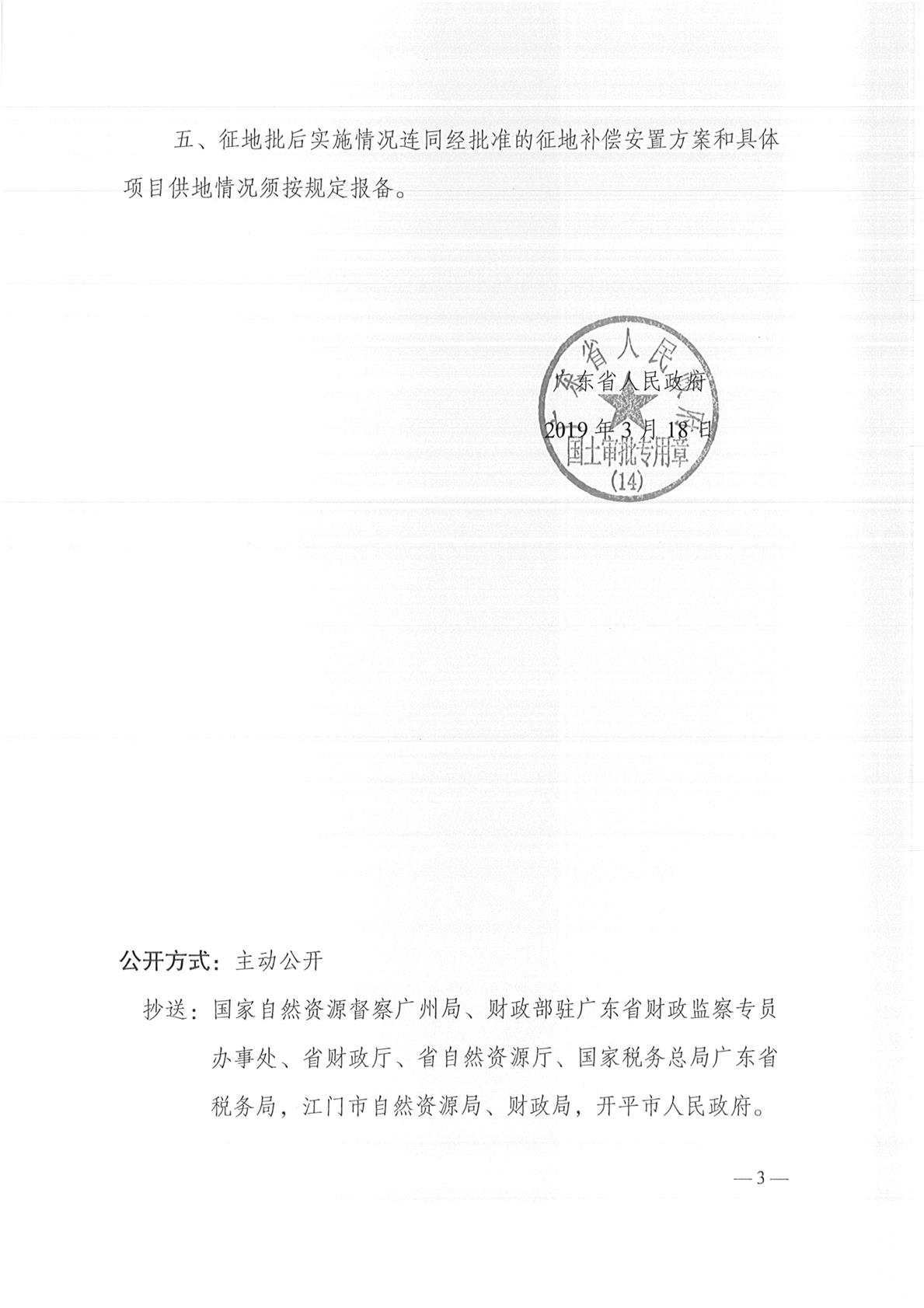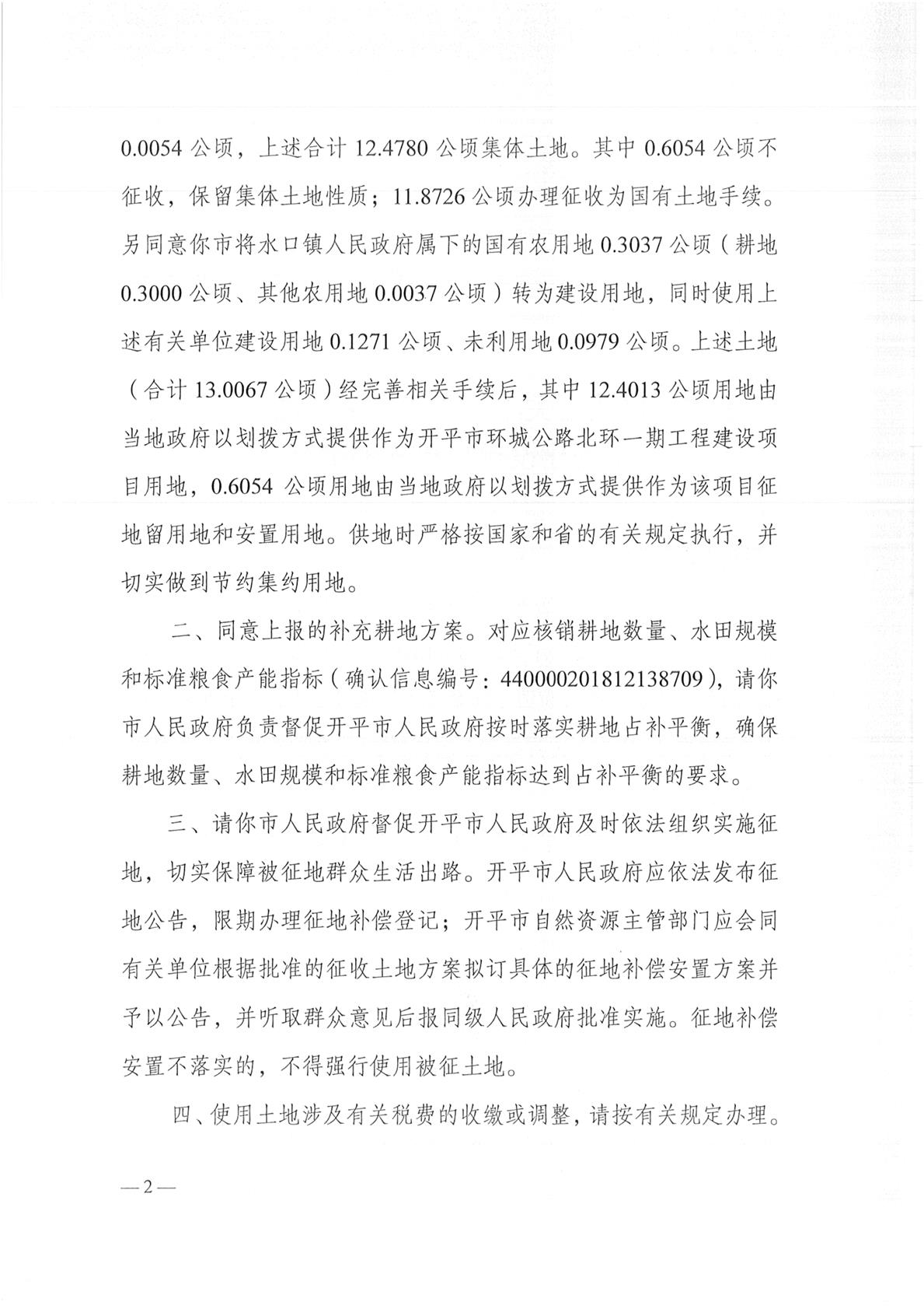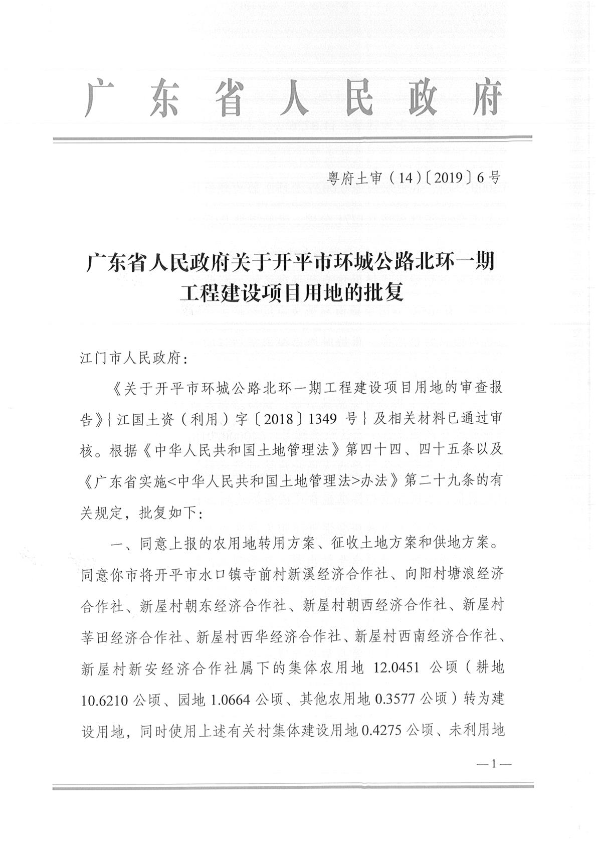 粵府土審(14)[2019]6號-廣東省人民政府關于開平市環城公路北環一期工程建設項目用地的批復