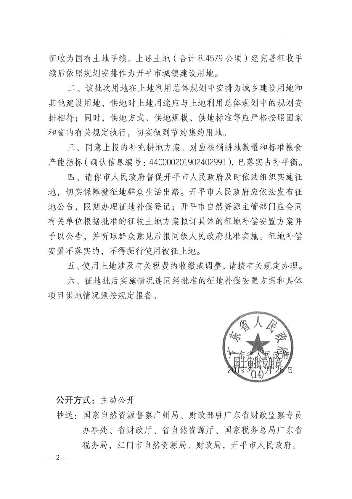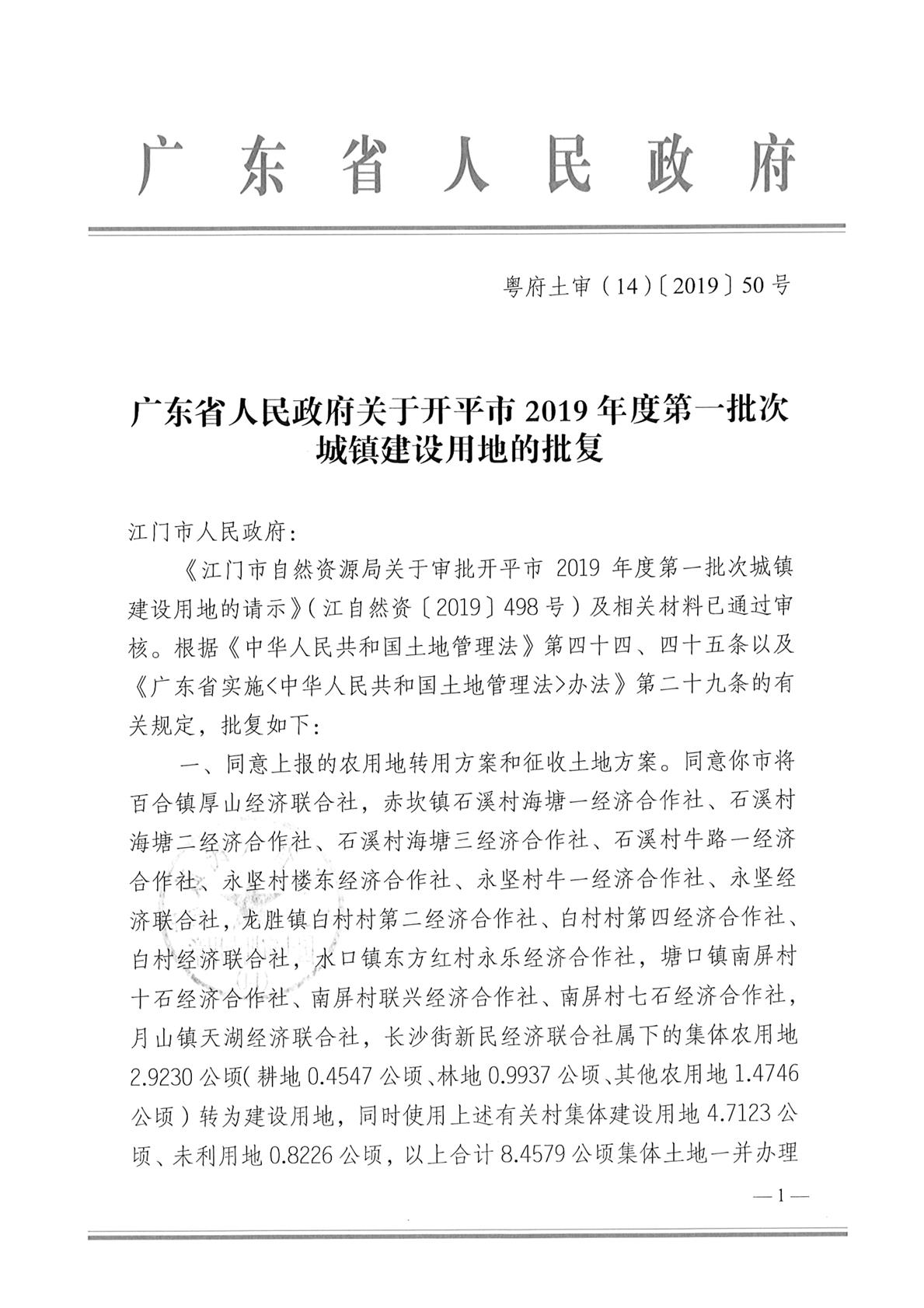 粵府土審(14)[2019]50號 廣東省人民政府關于開平市2019年度第一批次城鎮(zhèn)建設用地地批復