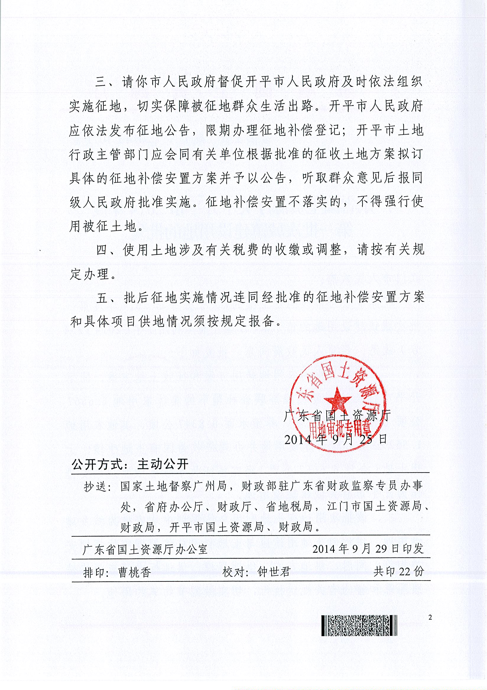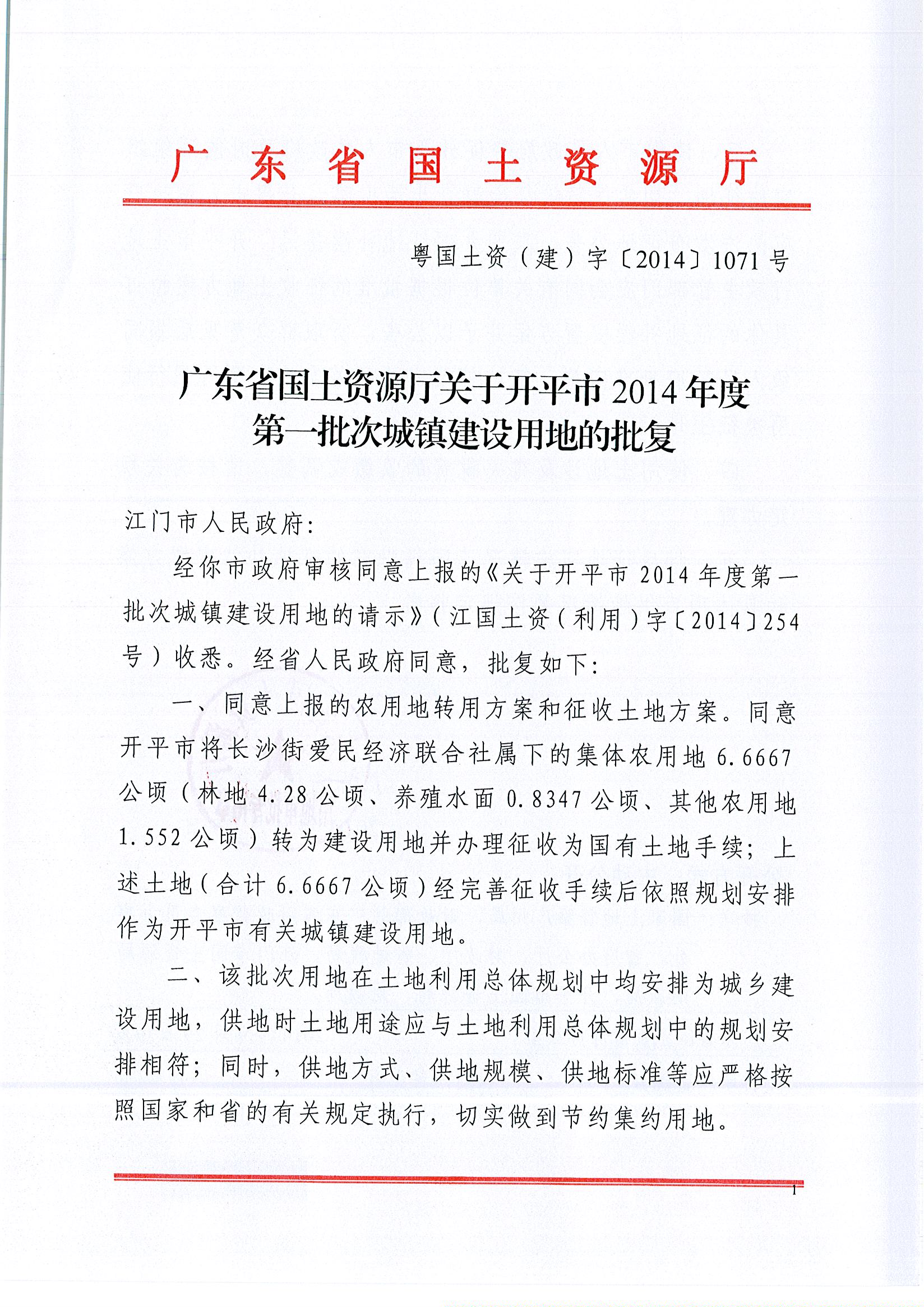 開平市2014年度第一批次城鎮(zhèn)建設(shè)用地的批復(fù)
