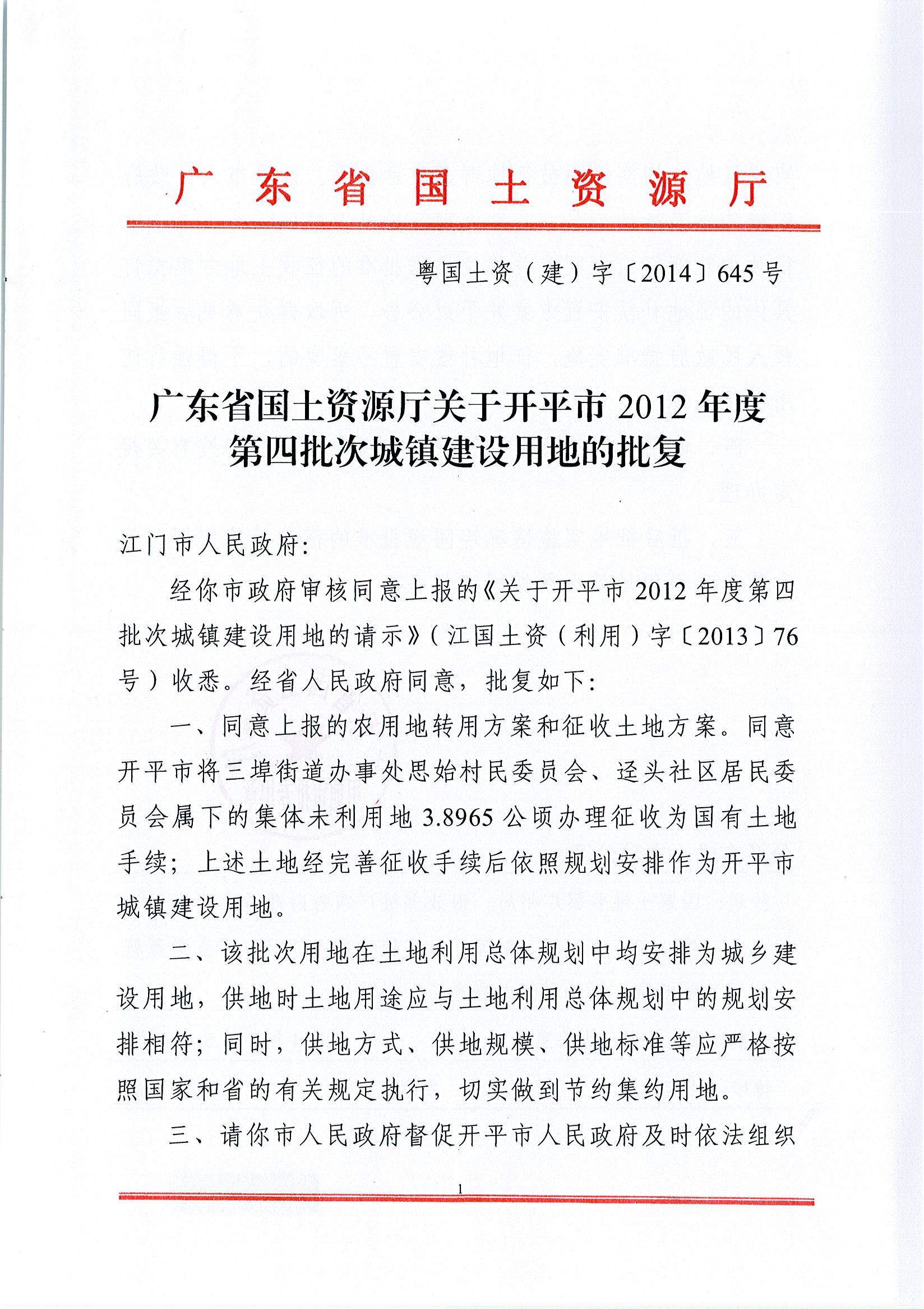 開平市2012年度第四批次城鎮建設用地的批復