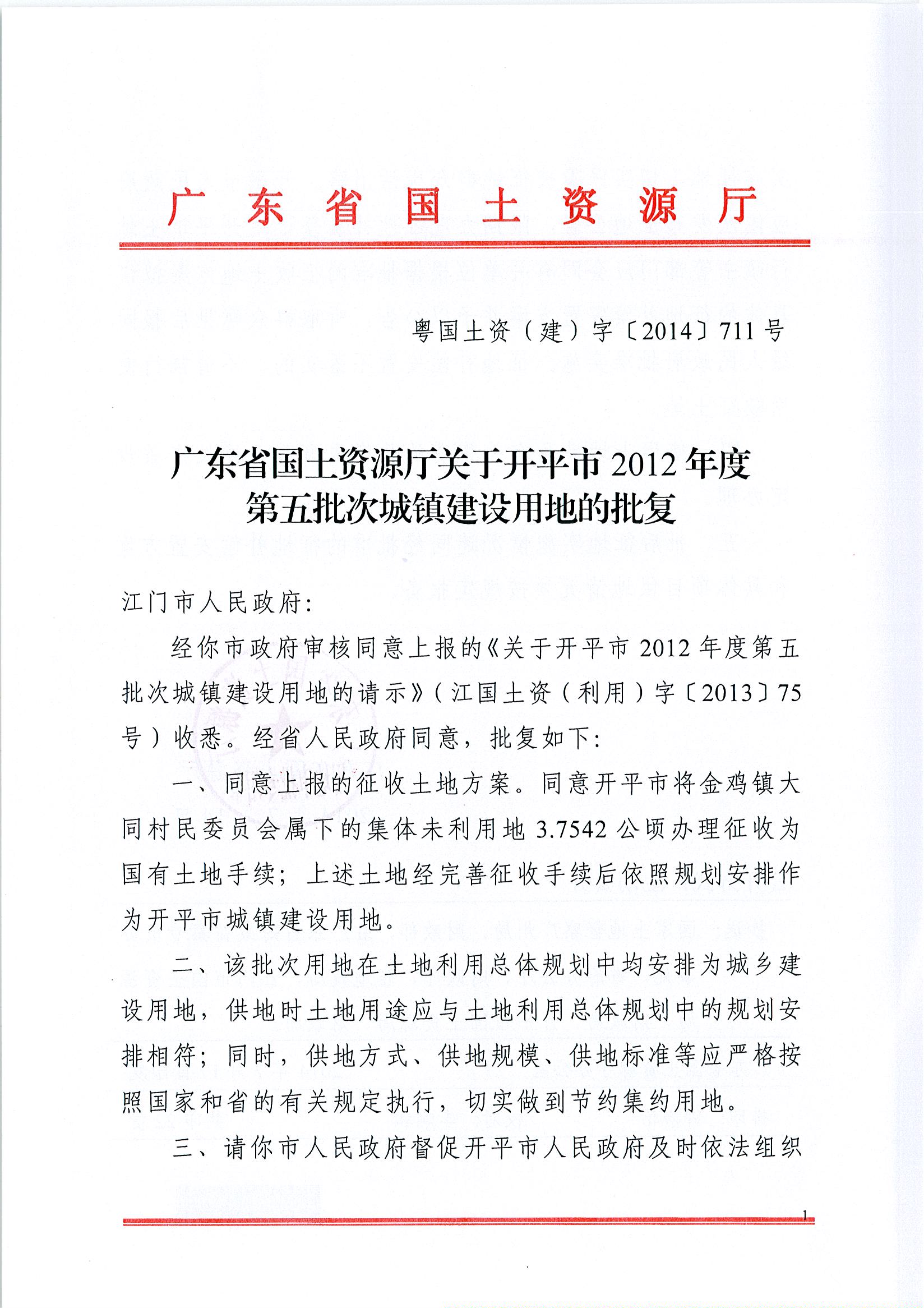 開平市2012年度第五批次城鎮建設用地的批復