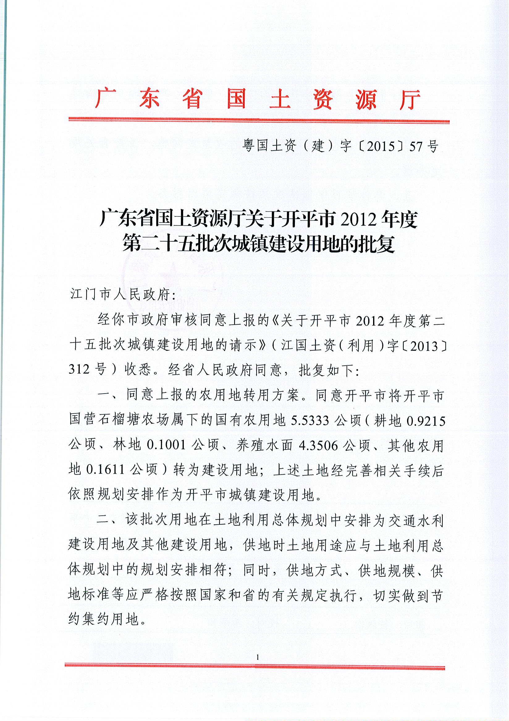 開平市2012年度第二十五批次城鎮建設用地的批復