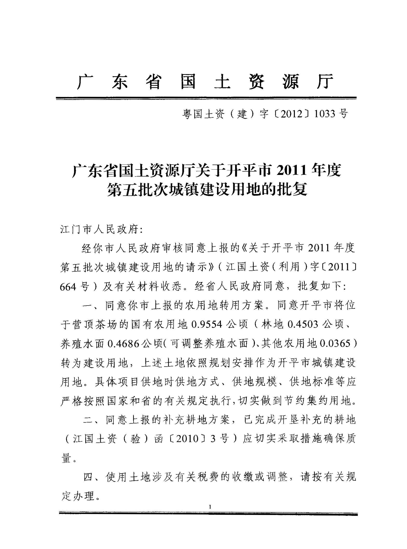 開平市2011年度第五批次城鎮建設用地的批復