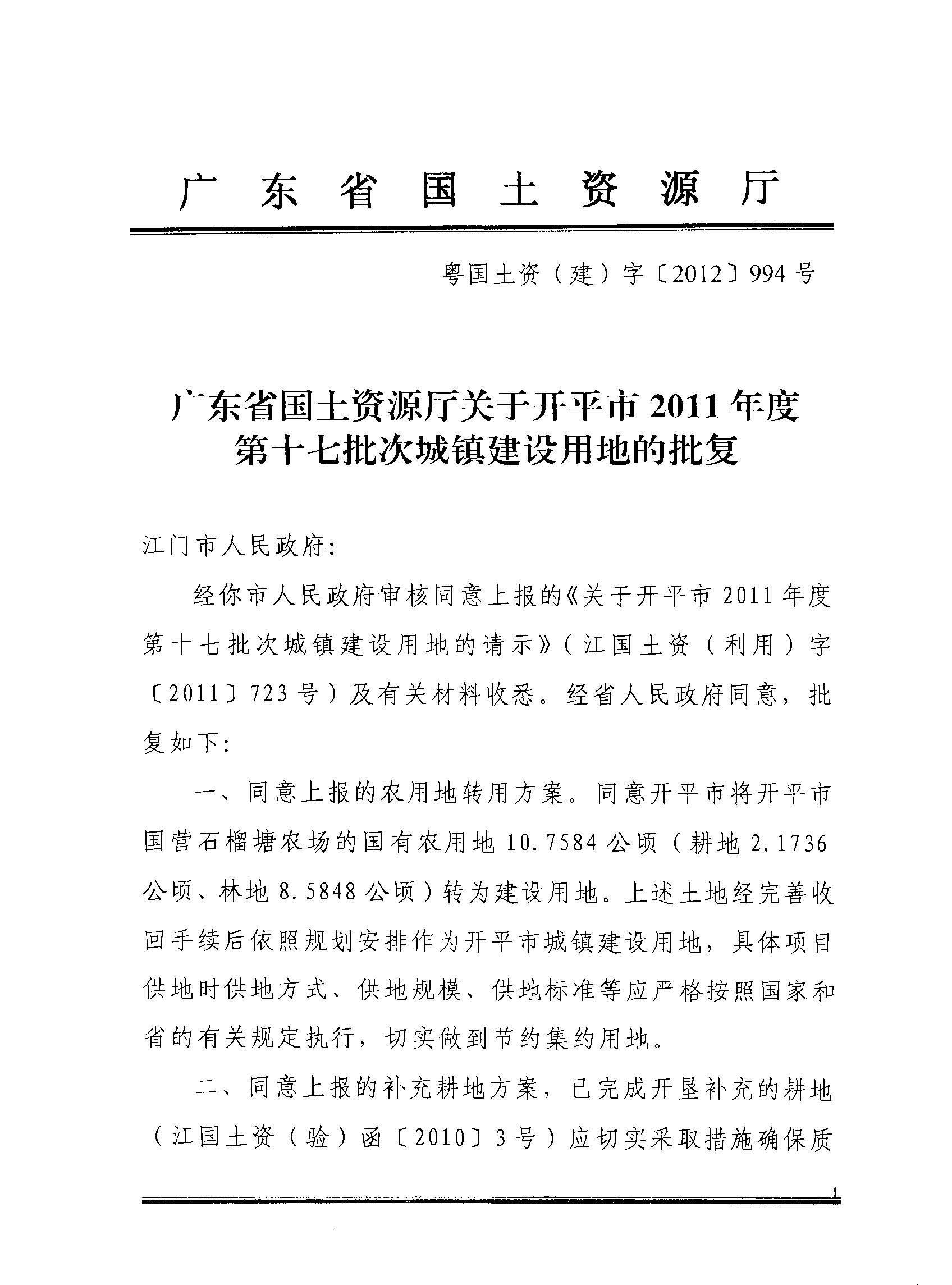 開平市2011年度第十七批次城鎮(zhèn)建設(shè)用地的批復(fù)