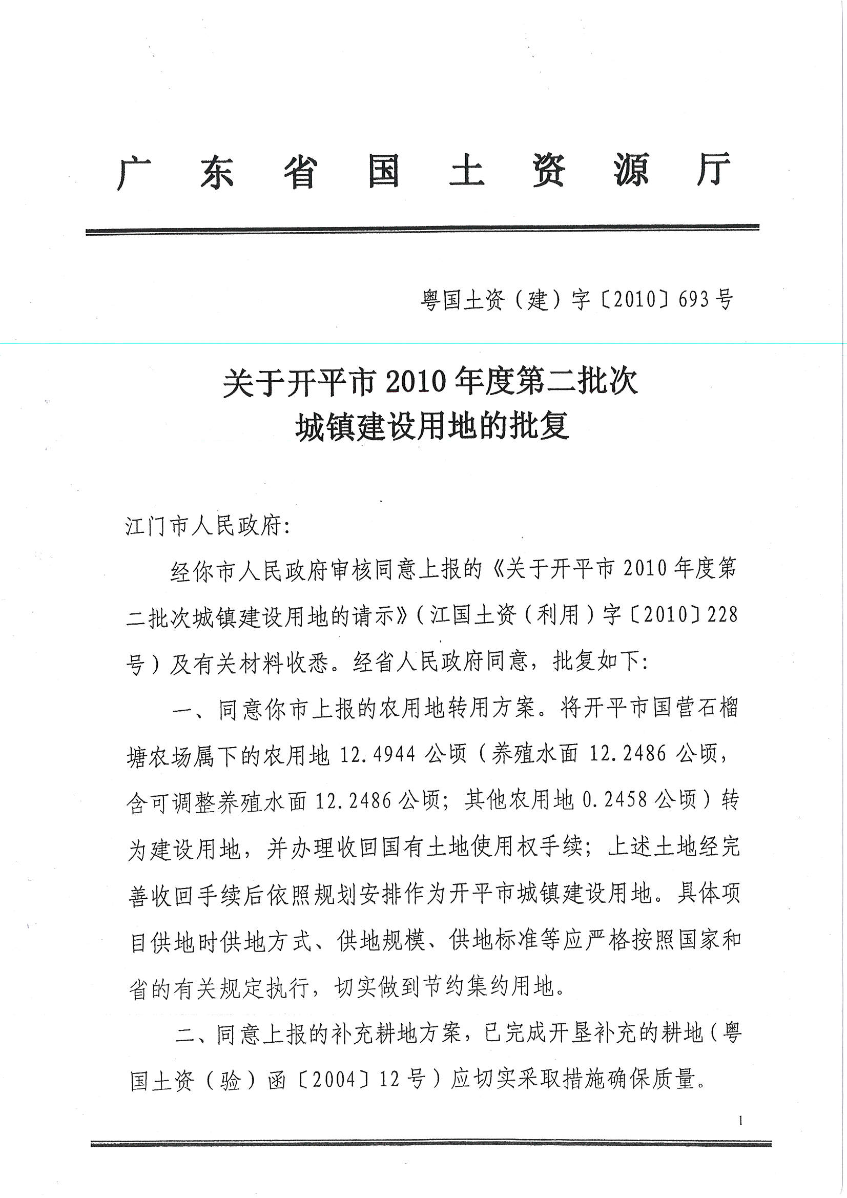 開平市2010年度第二批次城鎮建設用地的批復