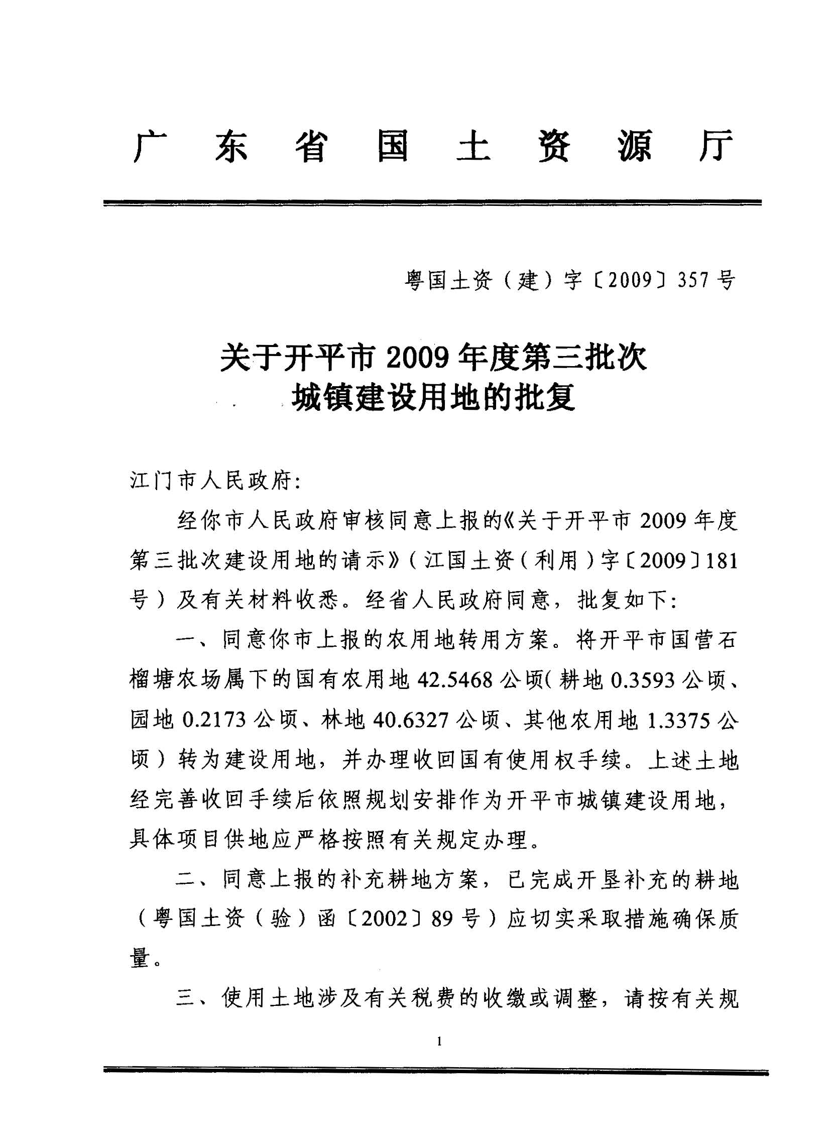 開平市2009年度第三批次城鎮(zhèn)建設(shè)用地的批復