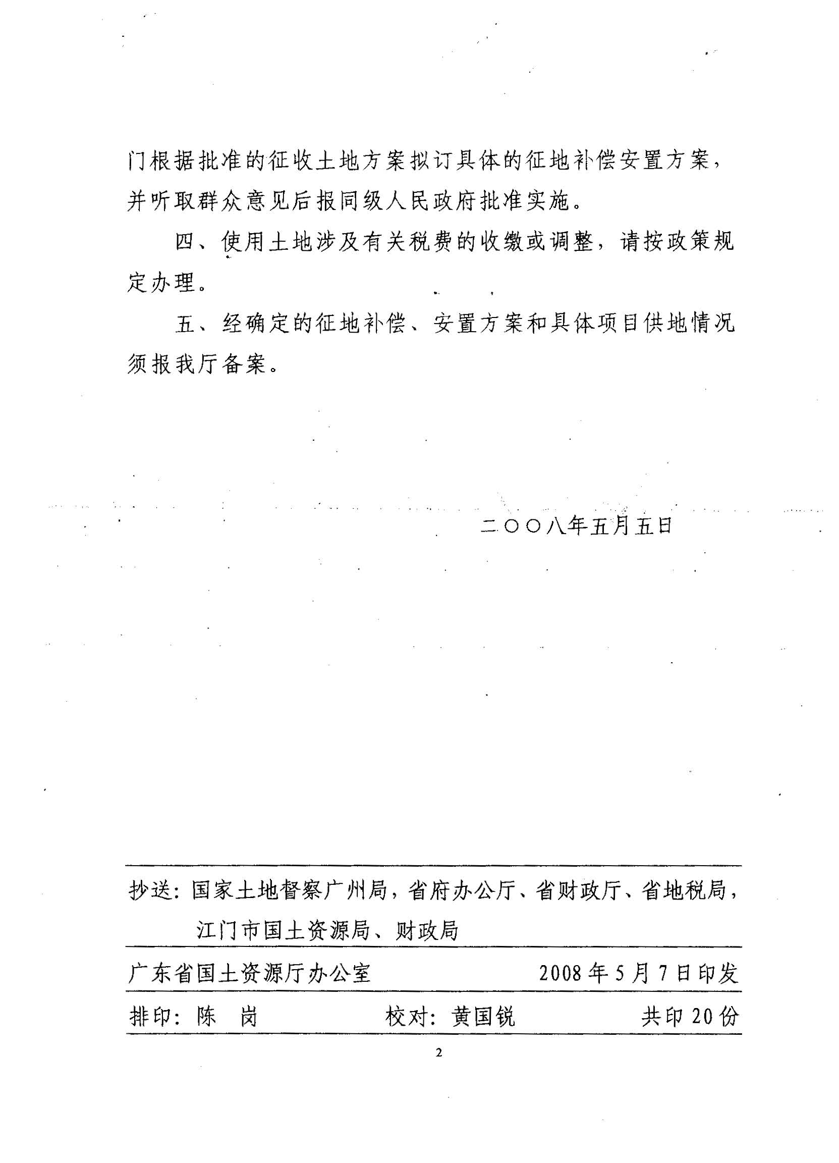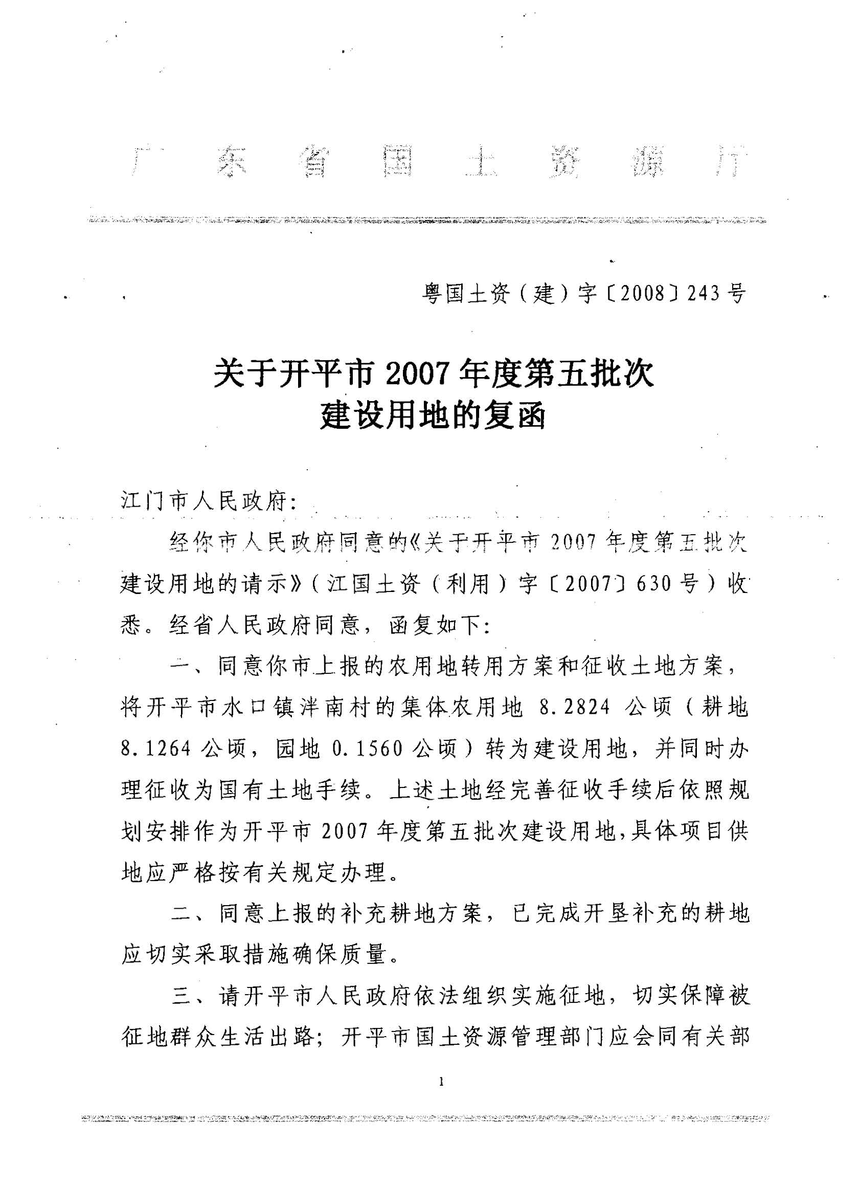 開平市2007年度第五批次建設(shè)用地的復(fù)函