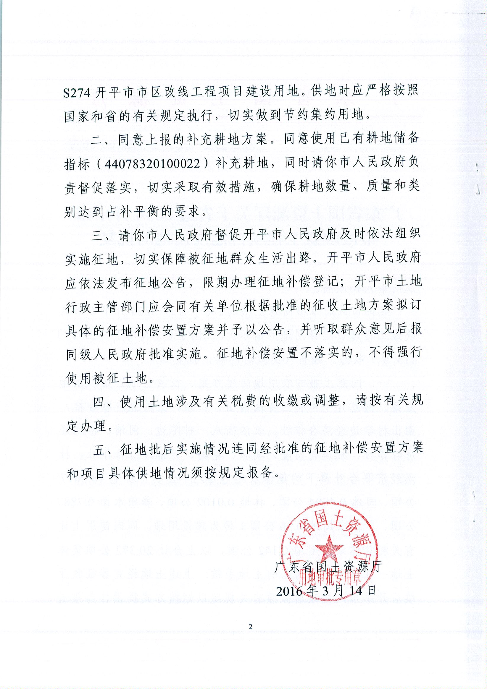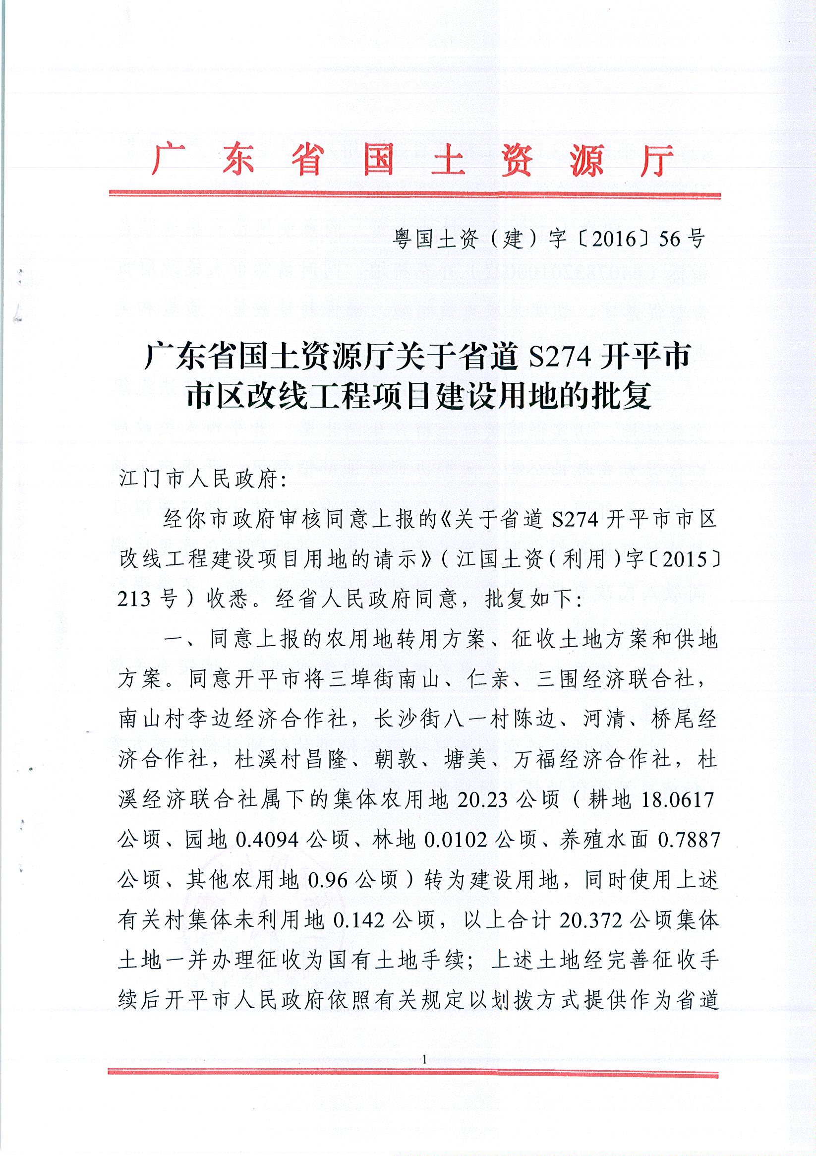 廣東省國土資源廳關于省道S274開平市市區改線工程項目建設用地的批復