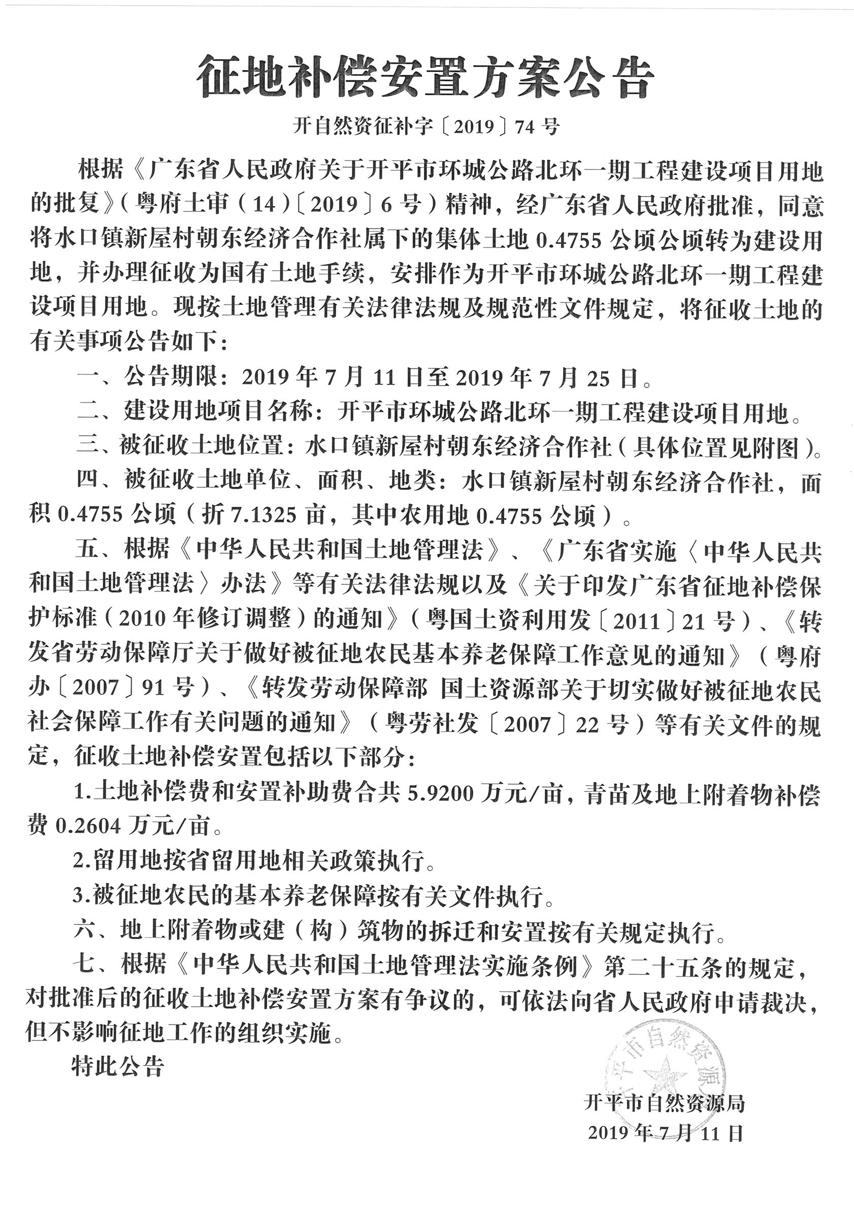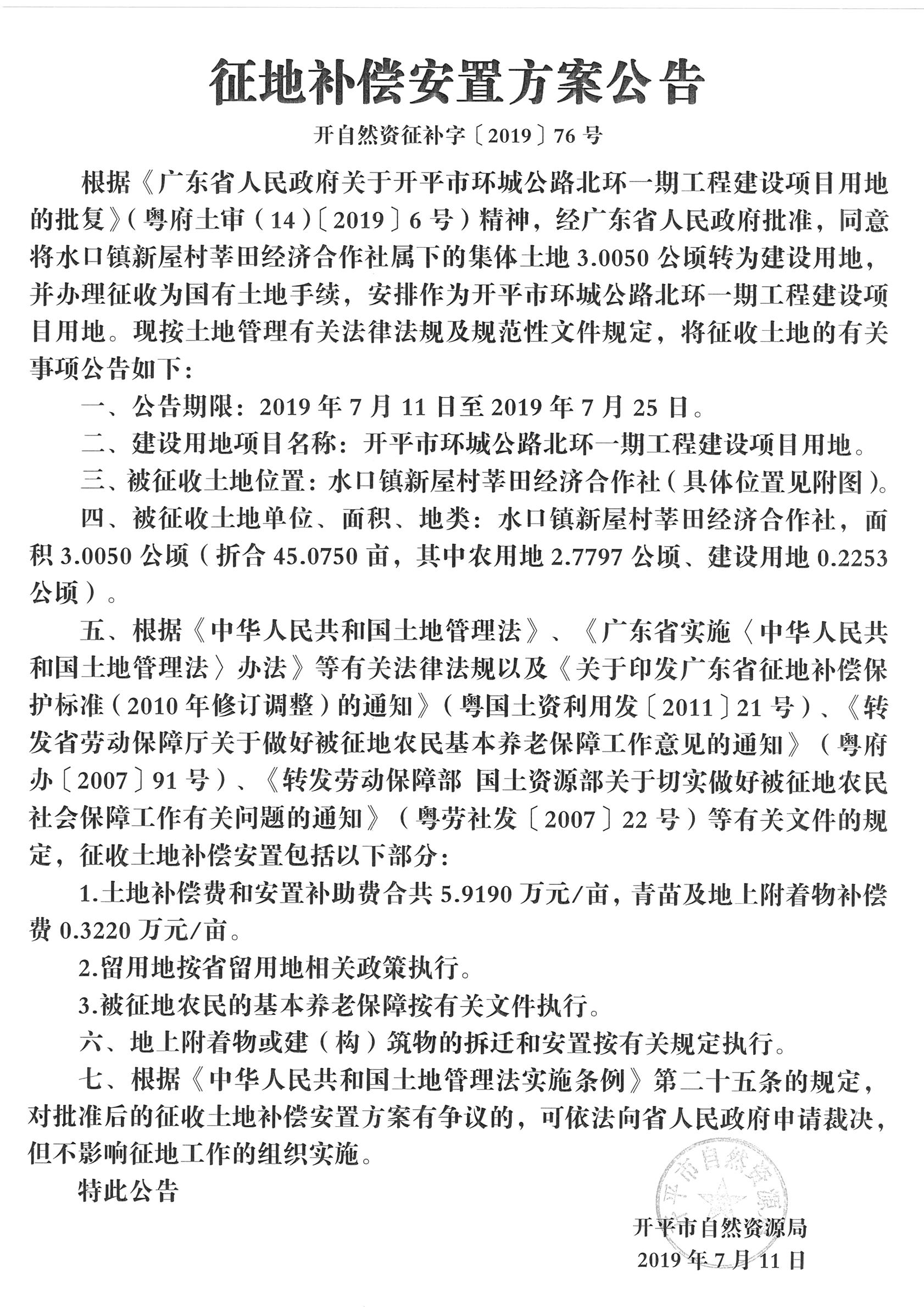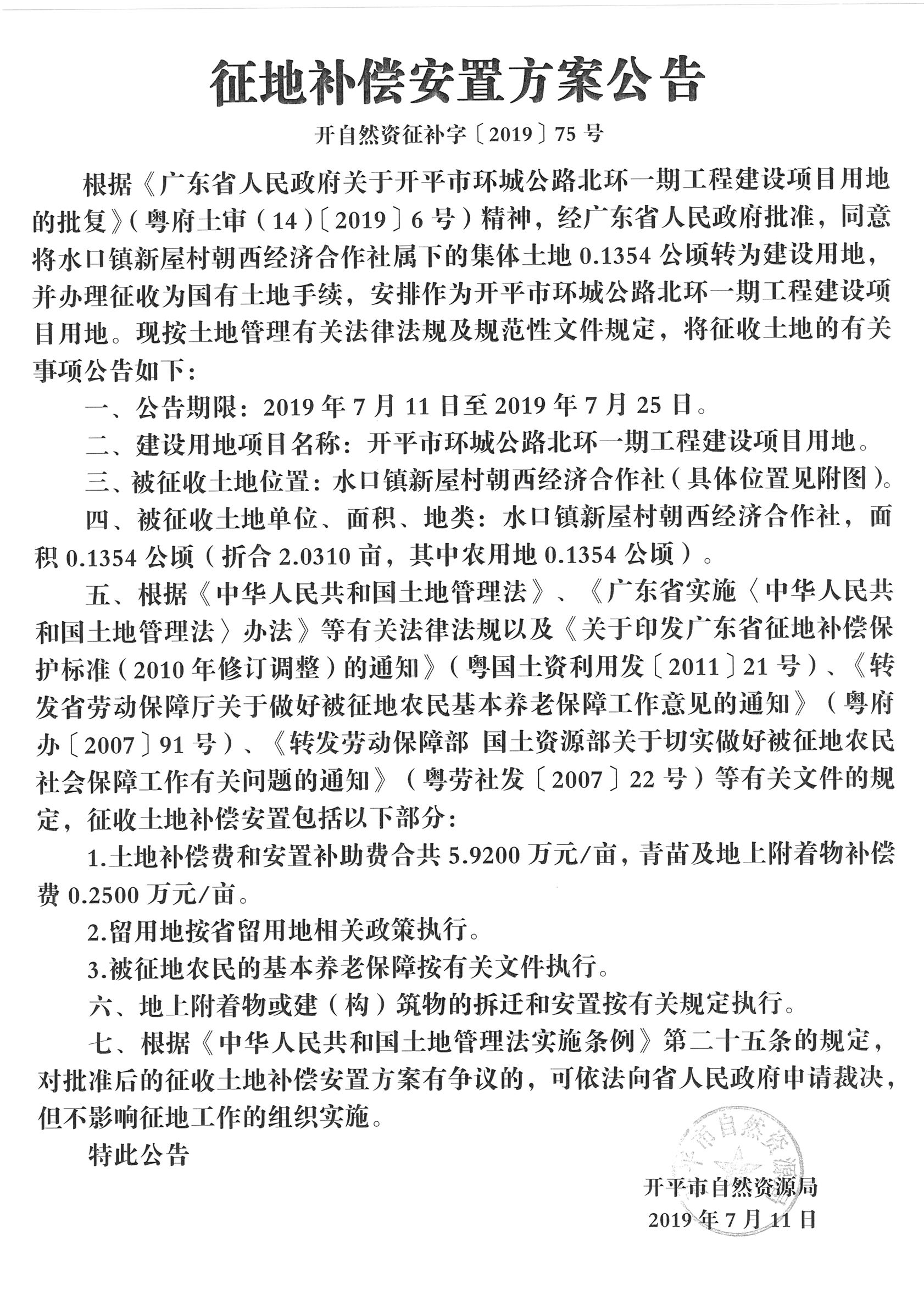 征地補(bǔ)償安置方案公告(開平市環(huán)城公路北環(huán)一期工程建設(shè)項(xiàng)目用地)
