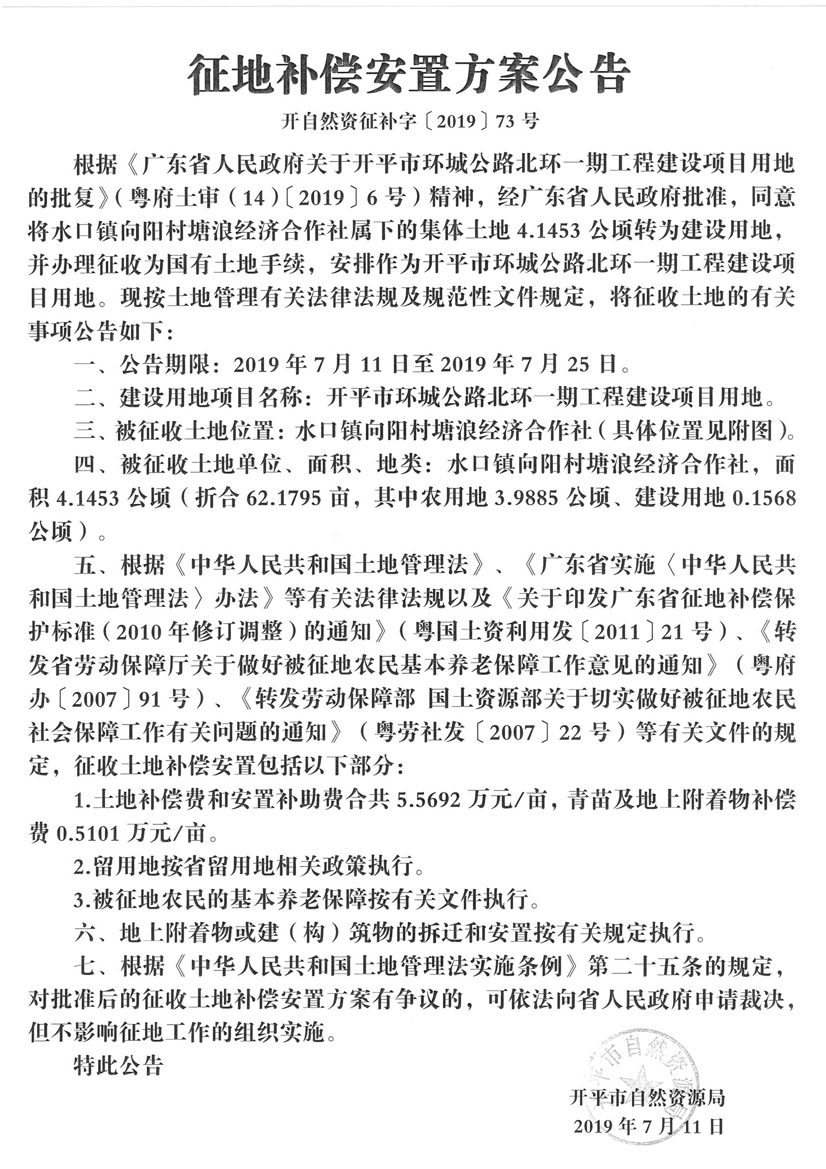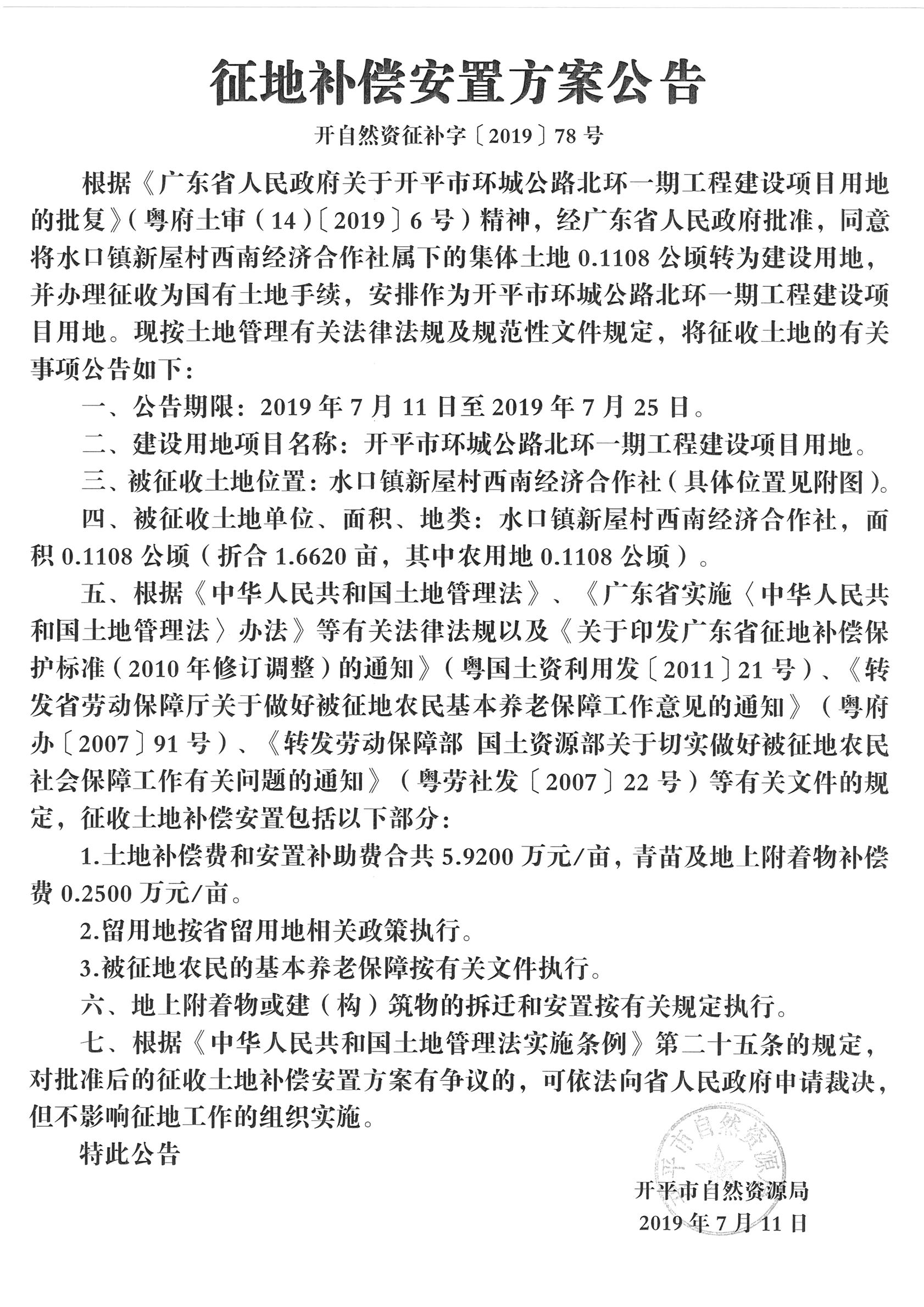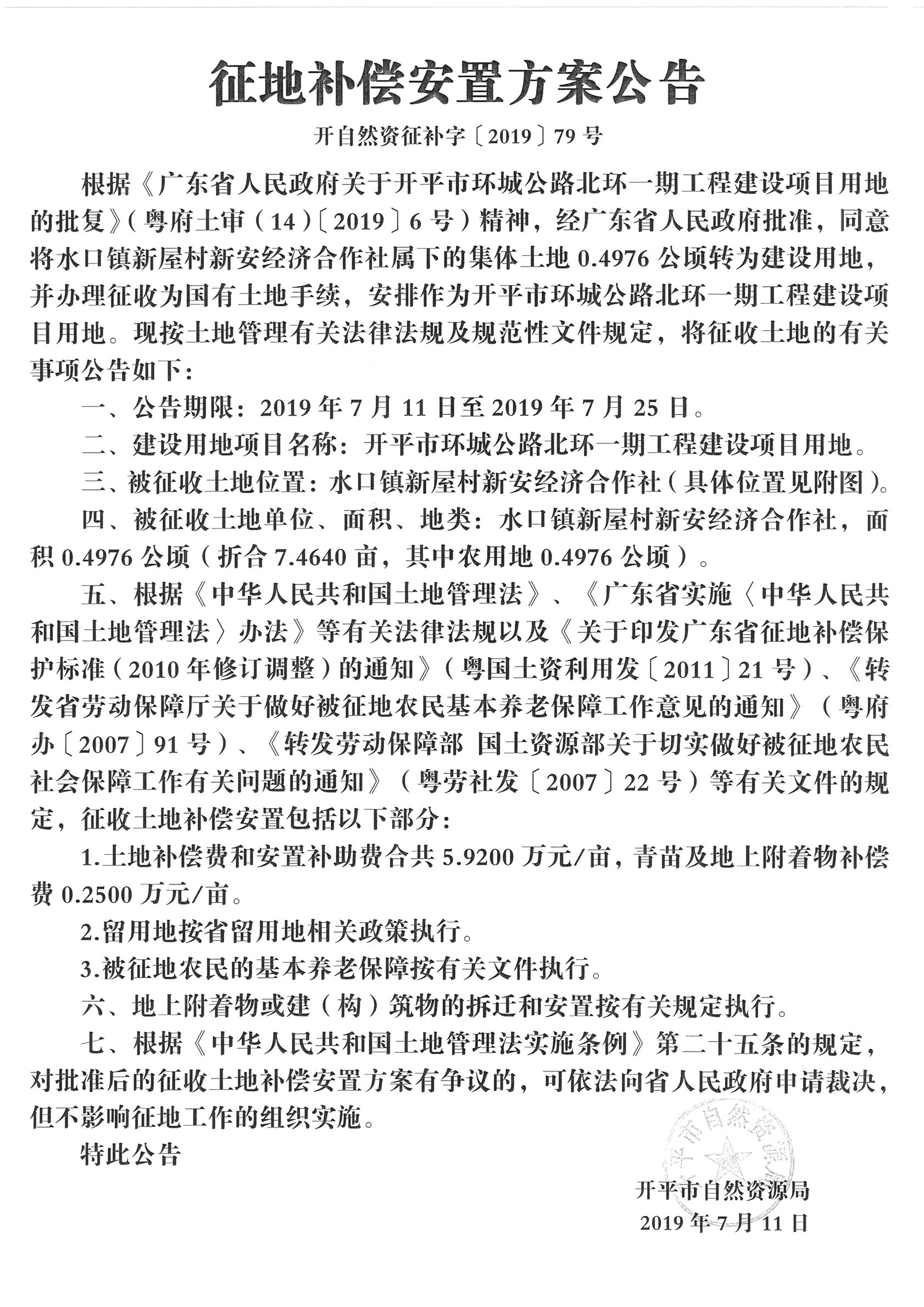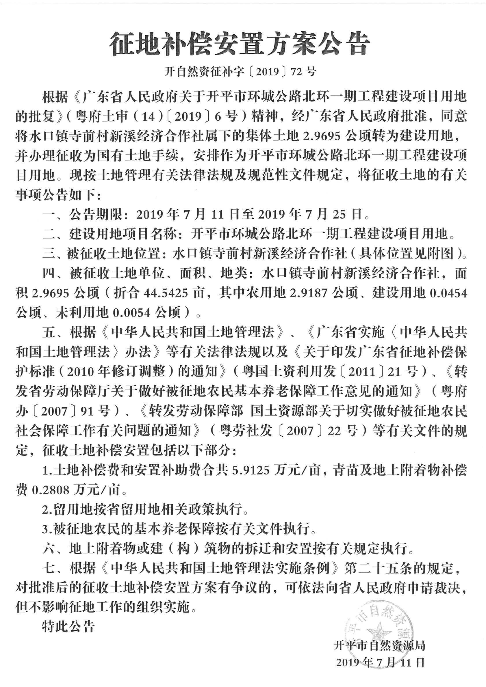 征地補(bǔ)償安置方案公告(開平市環(huán)城公路北環(huán)一期工程建設(shè)項(xiàng)目用地)