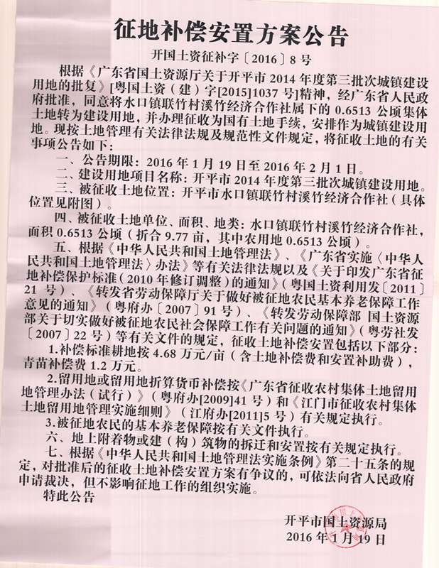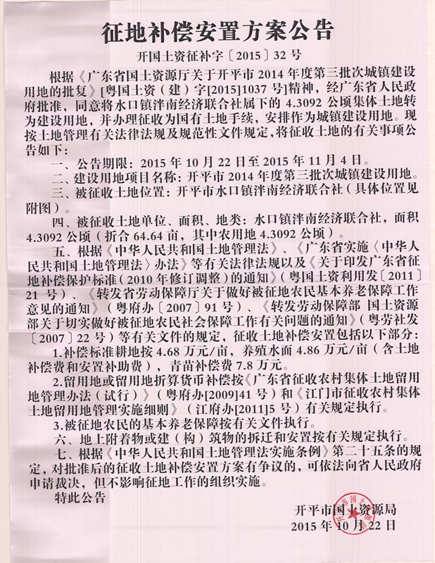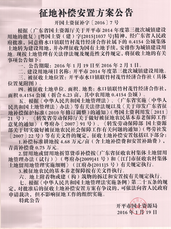 征地補(bǔ)償安置方案公告(開平市2014年度第三批次城鎮(zhèn)建設(shè)用地)