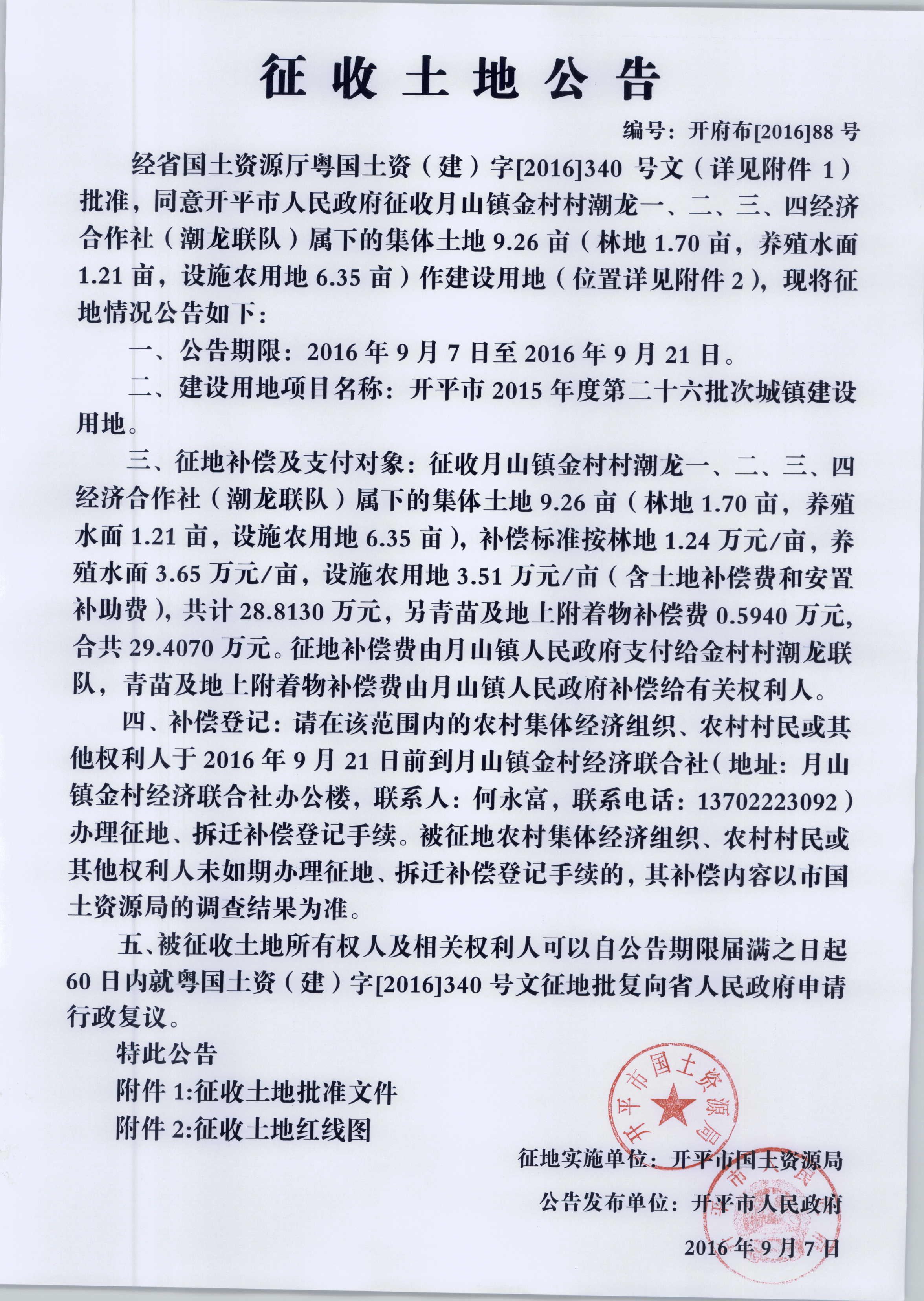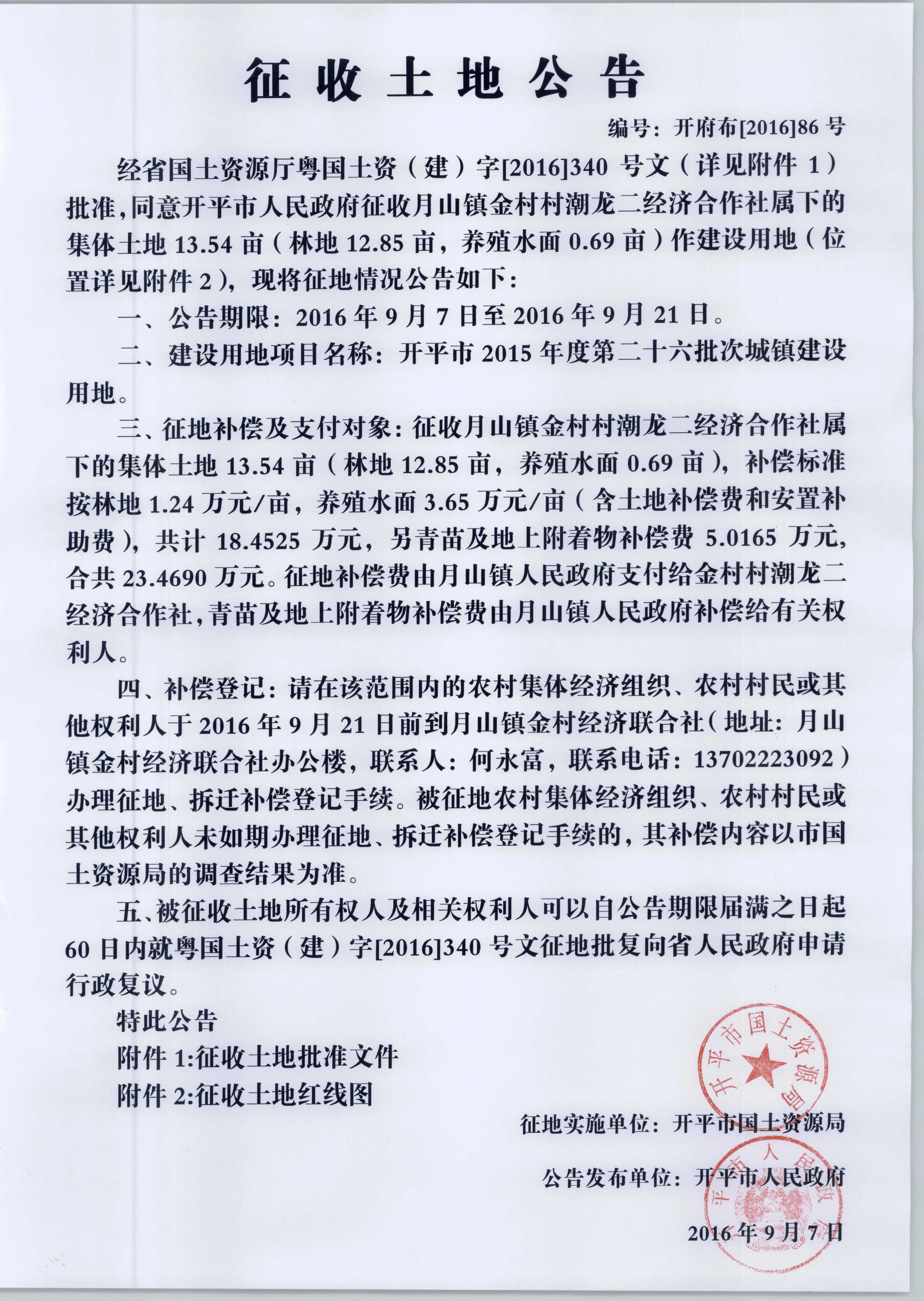 征收土地公告(開平市2015年度第二十六批次城鎮建設用地)