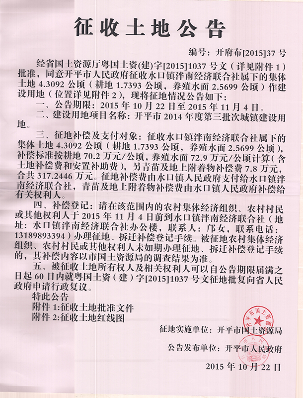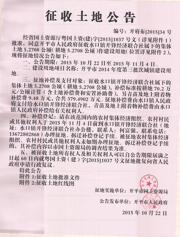 征收土地公告(開平市2014年度第三批次城鎮建設用地)