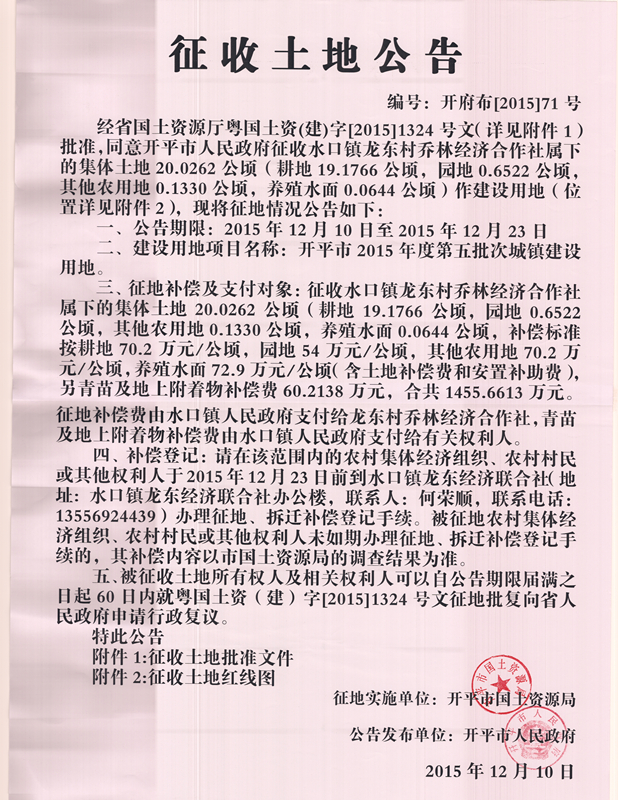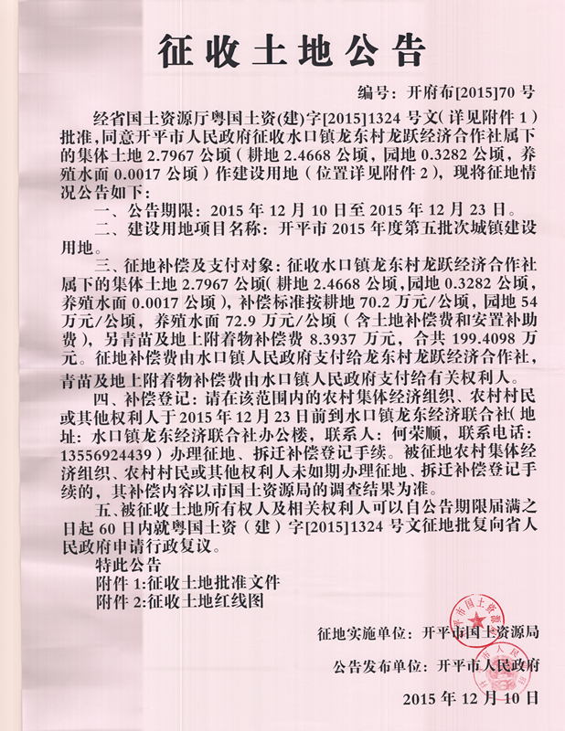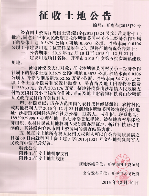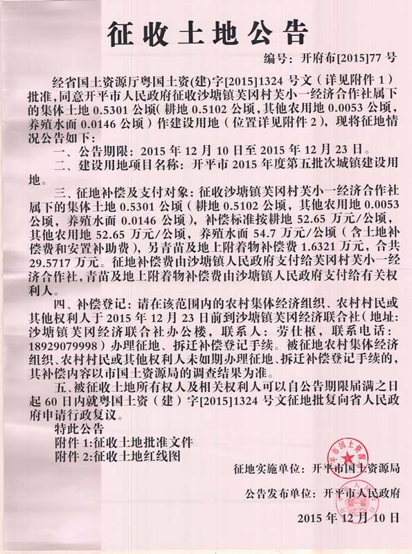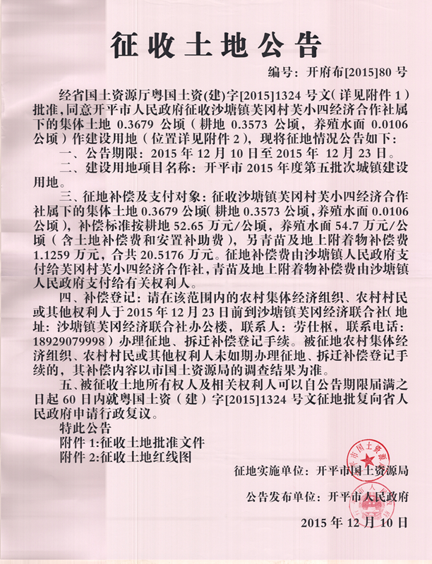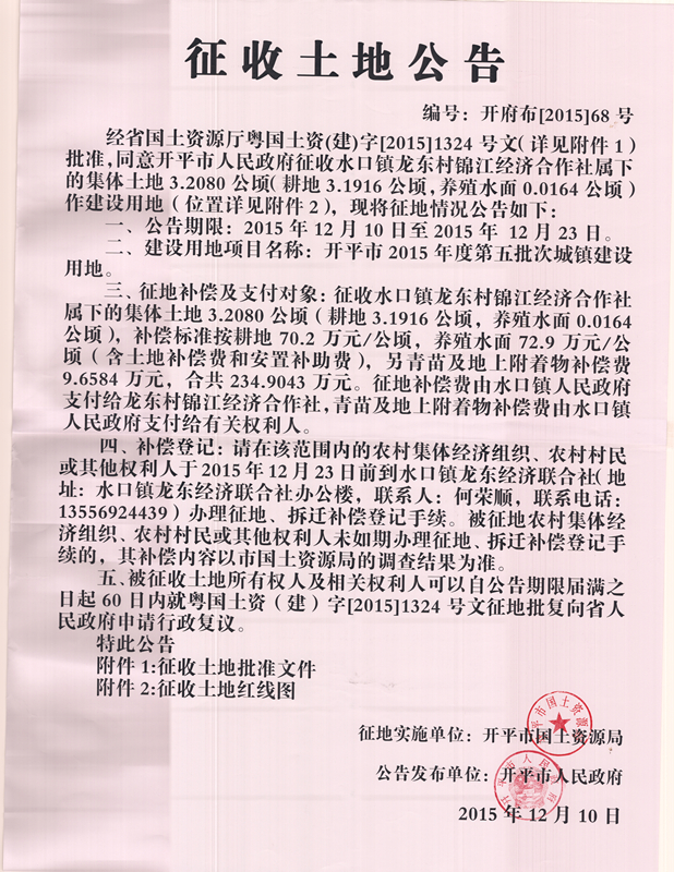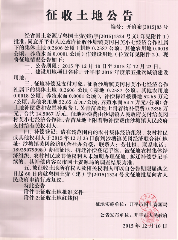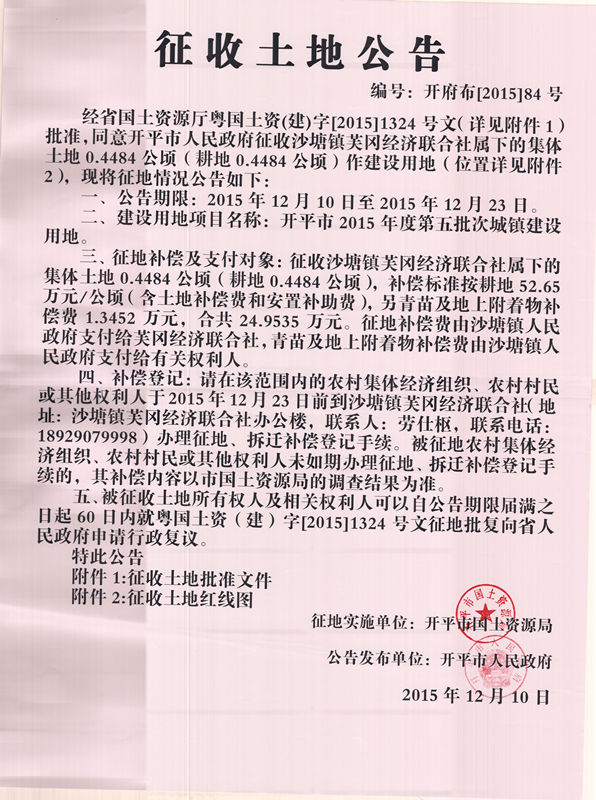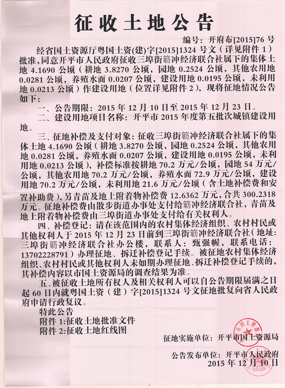 征收土地公告(開平市2015年度第五批次城鎮建設用地)