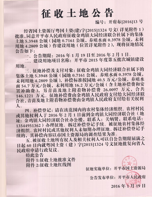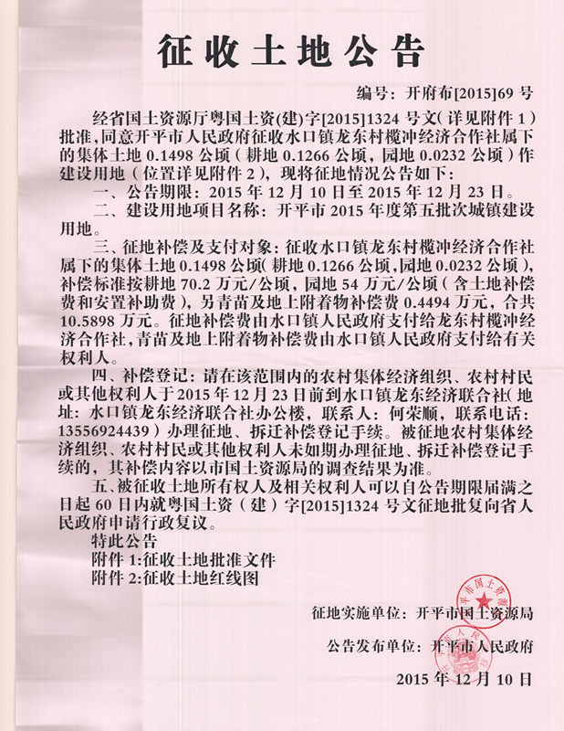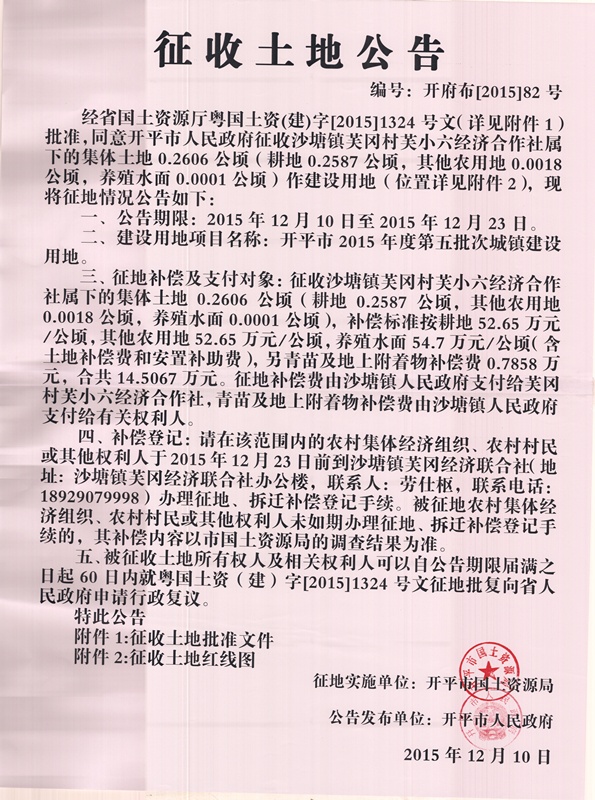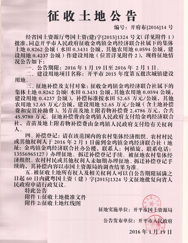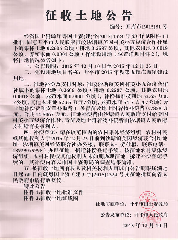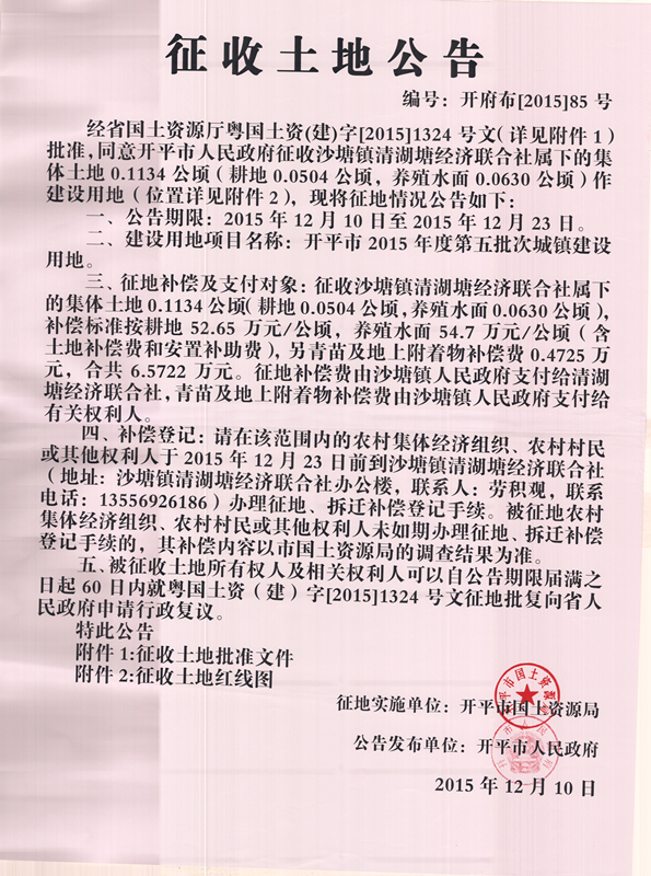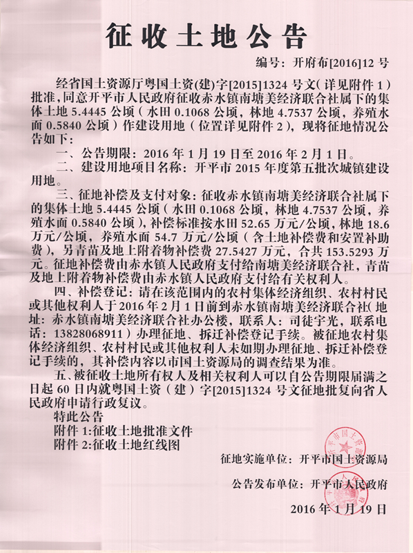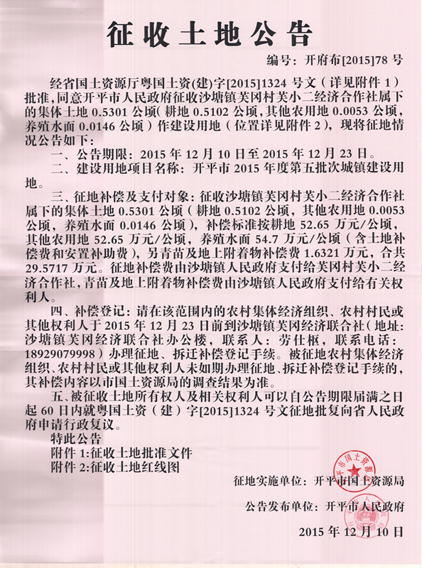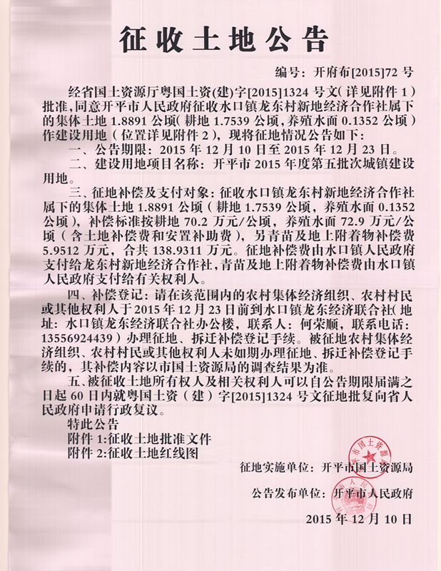 征收土地公告(開平市2015年度第五批次城鎮建設用地)