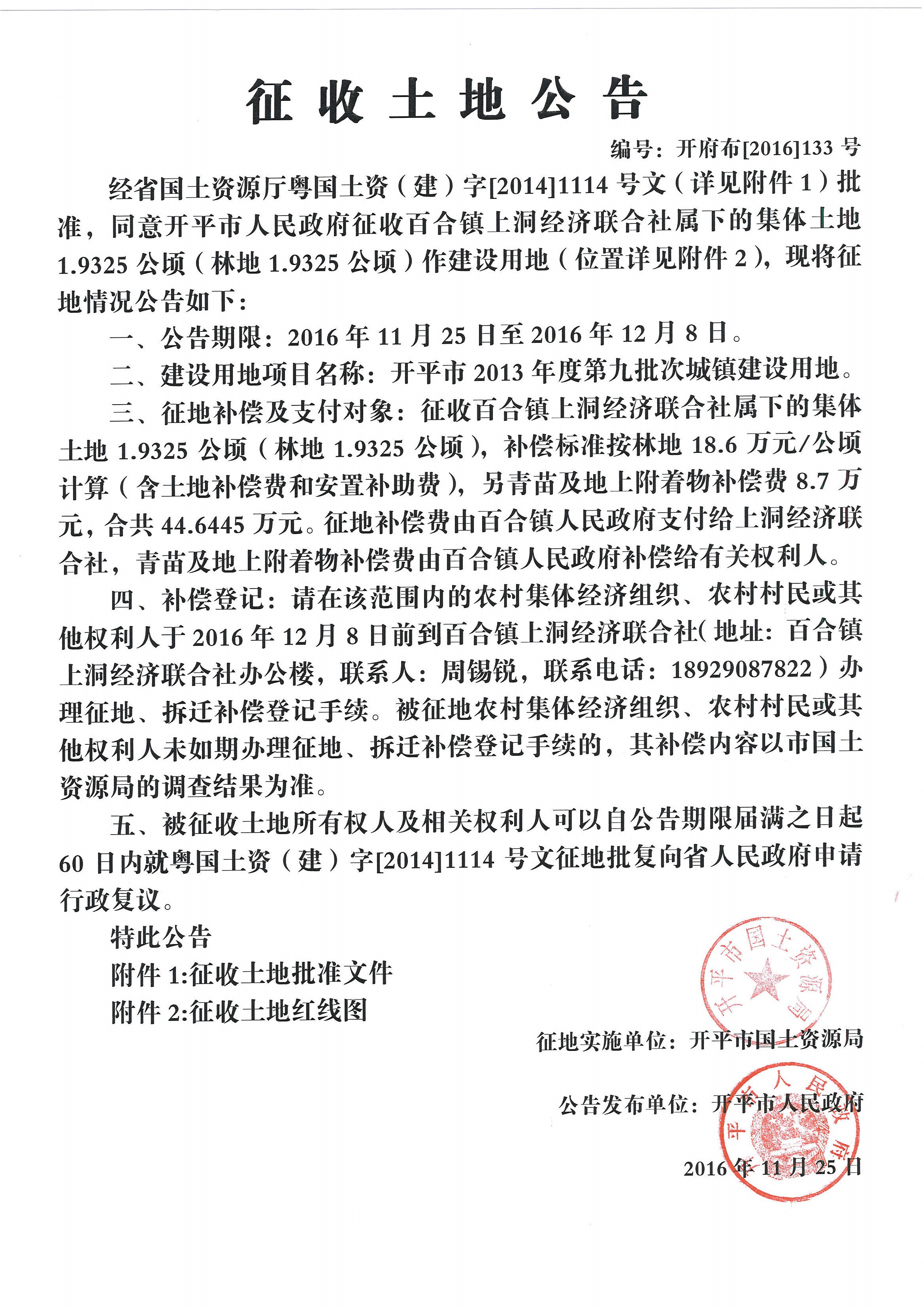 征收土地公告(開平市2013年度第九批次城鎮建設用地)