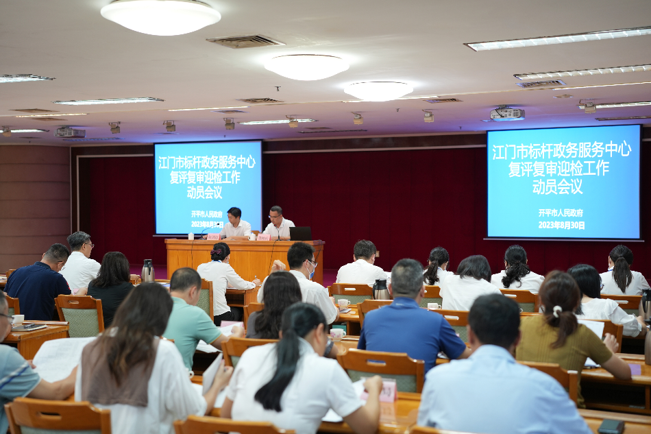 根據國家、省、市標桿政務服務中心建設要求,為進一步推進政務服務中心標準化規范化便利化建設,以高姿態、高標準迎接江門市標桿政務服務中心復評復審工作,8月30日,開平市人民政府行政服務中心(以下簡稱“市行政服務中心”)召開復評復審迎檢工作動員會。會議由市政數局黨組成員、市行政服務中心主任顏劍超主持,市府辦黨組成員熊柏慶出席會議并講話,進駐市行政服務中心的單位分管領導、服務窗口組長和審辦后臺負責人、市行政服務中心全體干部職工參加會議。 會上,市行政服務中心對標江門市標桿政務服務中心復評復審指標,從“管理完善度、建設規范度、服務成熟度、應用創新度”四大維度解讀現場迎檢要點,分解任務,細化措施。