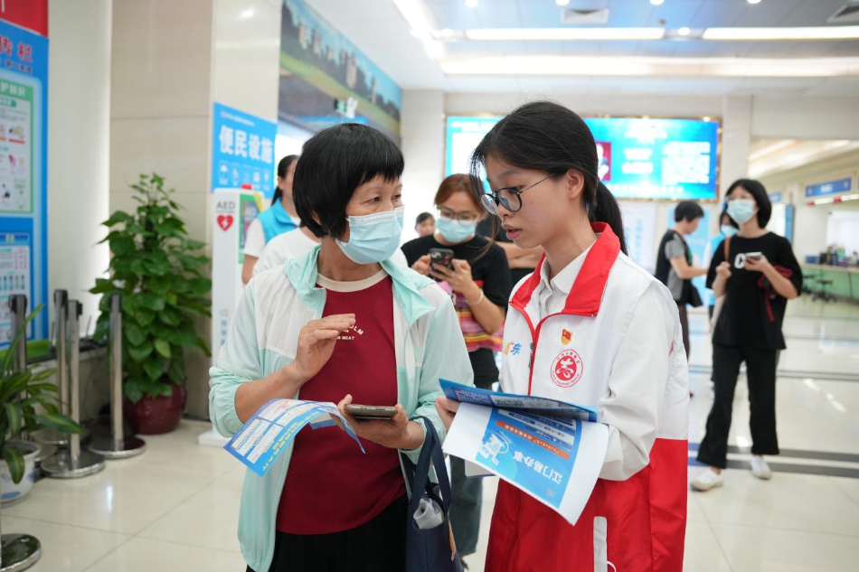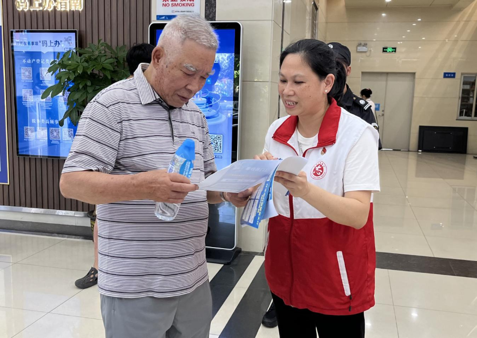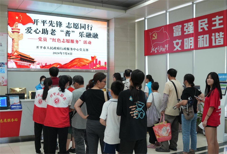 本次活動在開平市行政服務大廳一樓進行,為了活動的有序開展,黨員志愿者們早早候在一旁,引導群眾有序排隊,并為長者們提供咨詢、預約、引路等志愿服務。