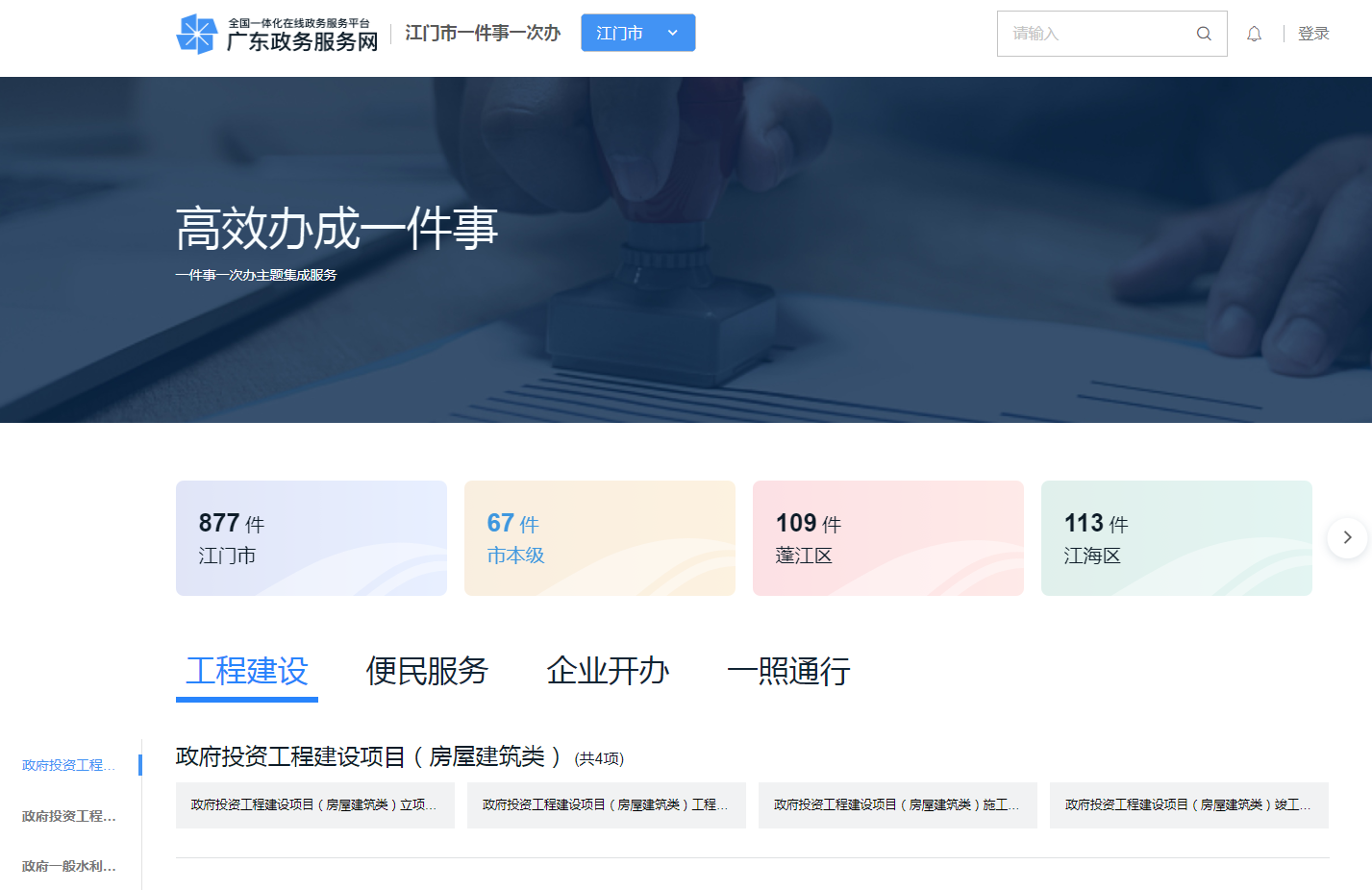 登錄廣東政務服務網,切換到江門市(https://www.gdzwfw.gov.cn/?region=440700),輸入一件事主題名稱,點擊搜索,或在特色創新模塊點擊【高效辦成一件事】,選擇“開平市”對應需要辦理的一件事服務,按流程在線操作即可完成辦理。