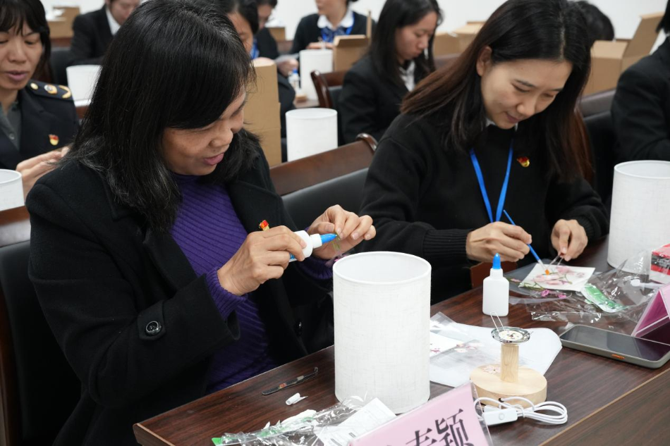 雅韻流光綻芳華”美勞沙龍--黨建帶工青婦團建活動。 活動首先由市政務服務和數據管理局婦女委員會主任陳春穎同志帶領深入學習貫徹省婦女第十四次代表大會精神。通過學習大會精神,進一步凝聚了全體女干部職工的力量,激發工作熱情,充分發揮“她”力量。 接著,由市行政服務中心導辦窗口組長梁柳開進行“強國復興有我”百姓故事分享。全體女干部職工對巾幗榜樣產生了崇高敬意,紛紛表示要向先進學習,積極提升業務素質和服務水平,帶著真心和感情服務群眾,讓群眾感受到政務服務的溫度。 最后,開展了壓花臺燈美勞沙龍活動。女干部職充分發揮想象和創造力,細致地將花朵、莖葉進行裁剪、構圖擺放、修正,然后將花材粘貼、固定,并為臺燈貼膜,經過一番精心點綴后,一盞盞繁花盛開的燈展現眼前。女干部職工臉上都洋溢著愉快的笑容,在溫馨氛圍的浸染中,享受著壓花藝術創作的獨特魅力。 此次活動進一步深化黨建引領,提升組織凝聚力,營造了關心關愛女職工的良好的節日氛圍,有利于引導女干部職工同心同德、踔厲奮發、勇毅前行,為奮力推動我市經濟社會高質量發展實現新突破貢獻巾幗力量。