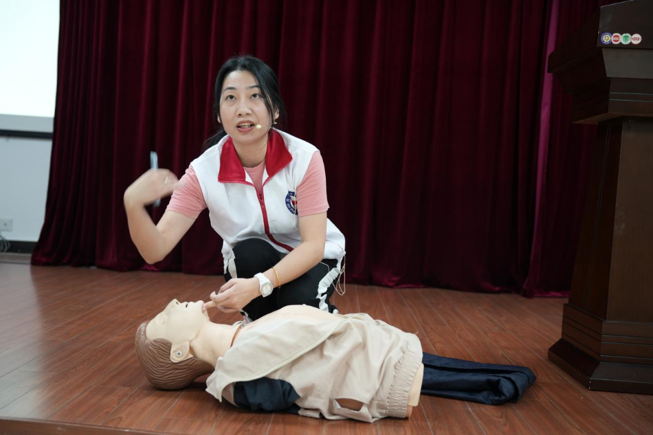 此次培訓邀請紅十字會講師梁丹彤進行授課,課上進行了心肺復蘇(CPR)、自動體外除顫儀(AED)的理論知識講解以及“模擬人”心肺復蘇搶救和操作演示。