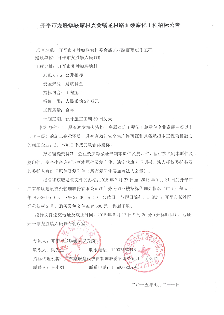 開平市龍勝鎮(zhèn)聯(lián)塘村委會(huì)蟠龍村路面硬底化工程招標(biāo)公告