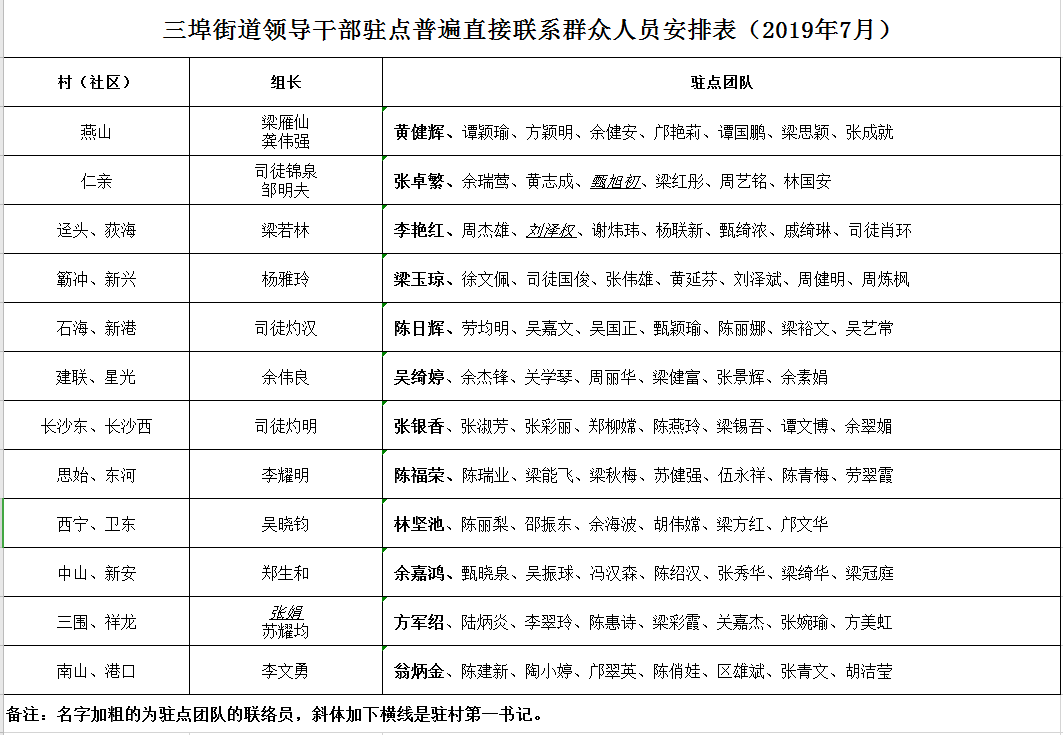三埠街道領導干部駐點普遍直接聯系群眾人員安排表(2019年7月)