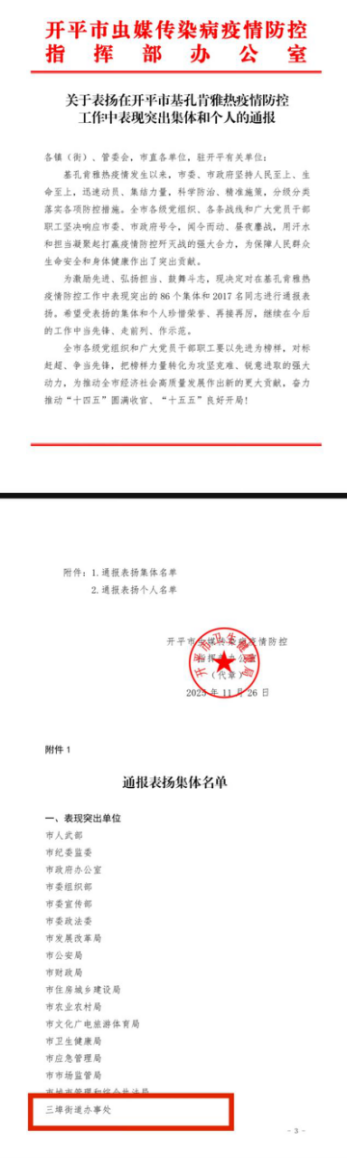 9月底起:堅持黨建引領,凝聚機關、企業、群眾多方力量持續開展愛國衛生運動,扎實推進蟲媒疫情防控工作,獲評“開平市基孔肯雅熱疫情防控表現突出單位”,用責任與擔當守護群眾健康。