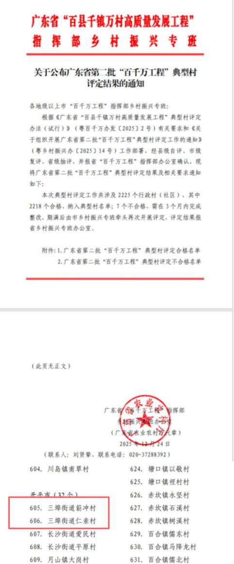 12月24日  “百千萬工程”典型村建設取得新進展,街道簕沖村、仁親村典型村建設經廣東省“百千萬工程”指揮部評定合格。