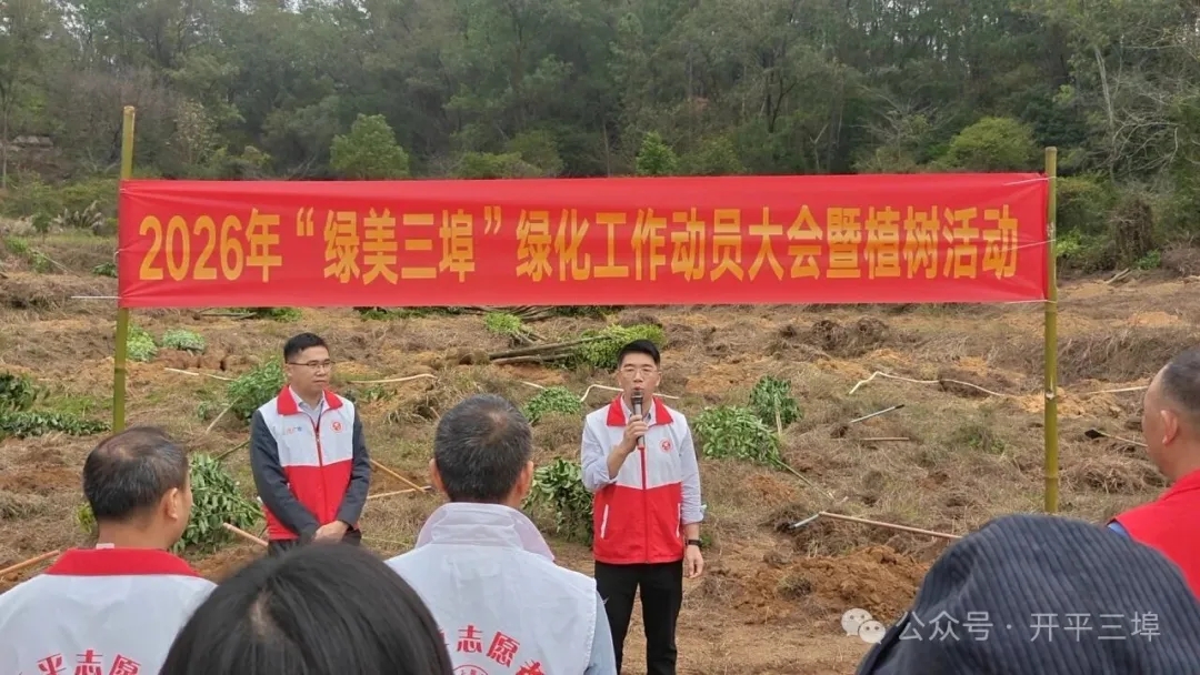 春日暖陽沐僑鄉,植綠護綠正當時。為深入踐行習近平生態文明思想,落實市委市政府“再造現代化新開平”部署要求,扎實推進鄉村綠化美化行動,近日,三埠街道在逕頭社區衛民公園空地隆重舉行2026年“綠美三埠”綠化工作動員大會暨植樹活動。副市長李青汶蒞臨指導,街道全體班子成員、機關部門負責人、22個村(社區)黨組織書記及逕頭社區黨員群眾代表近80人參加活動。