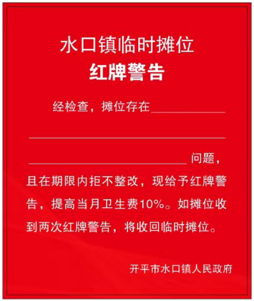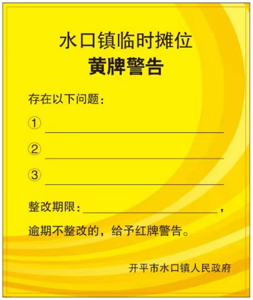 “紅黃牌”警示制度是指水口鎮(zhèn)執(zhí)法辦加強(qiáng)對臨時(shí)攤區(qū)(點(diǎn))市容環(huán)境衛(wèi)生管理情況的監(jiān)督考核,定期組織檢查,依法對不服從管理、違反市容和環(huán)境衛(wèi)生管理要求的臨時(shí)攤檔實(shí)行黃牌或紅牌警告。