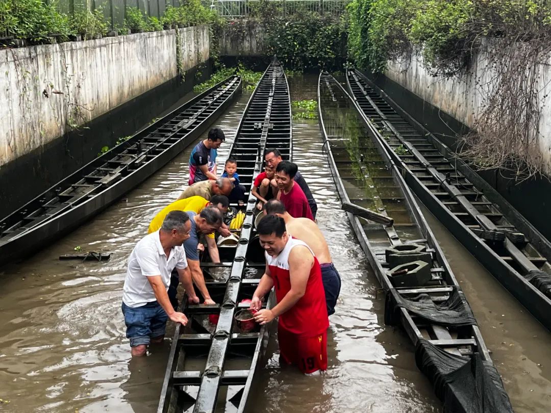 村民們趁著退潮,清理水生植物,舀干水,清理淤泥,再用稻草等把船身里外洗擦干凈,其后還要進行一系列的如補灰,打磨、上漆、調龍根等維修工序,龍舟才能正式使用。