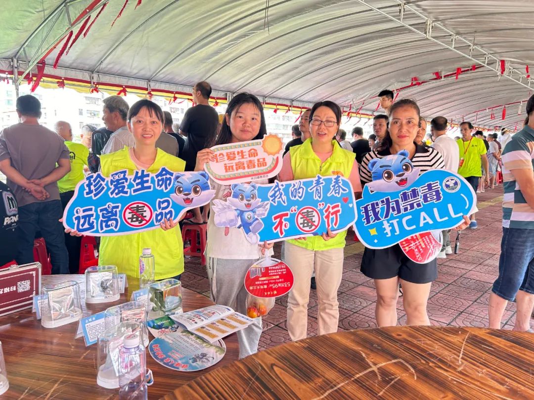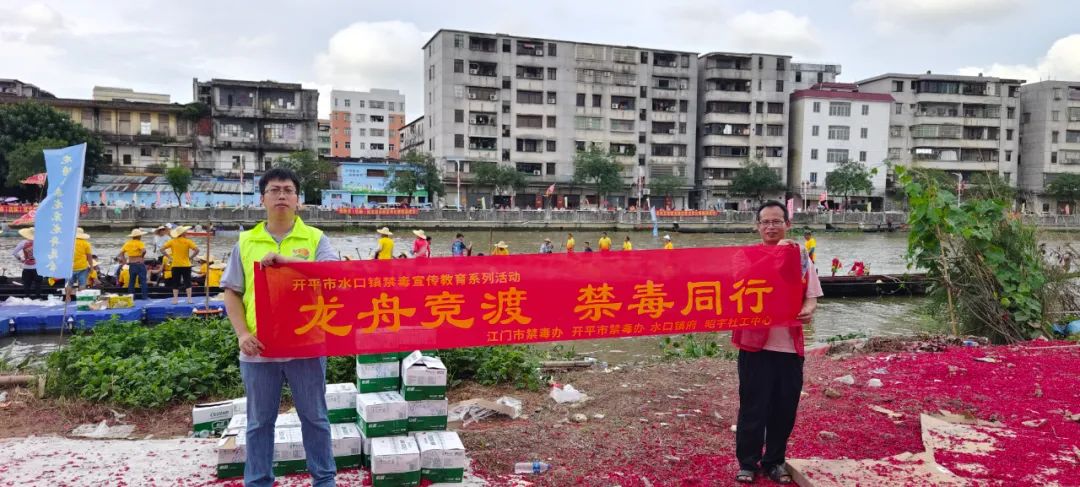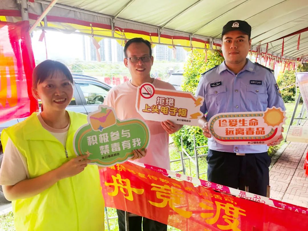 在保障龍舟活動順利進行的同時,水口鎮網格員充分利用節日熱鬧氛圍,聯合鎮禁毒辦、水口派出所、開平市昭宇社會綜合服務中心開展“龍舟競渡,禁毒同行”禁毒主題宣傳活動。