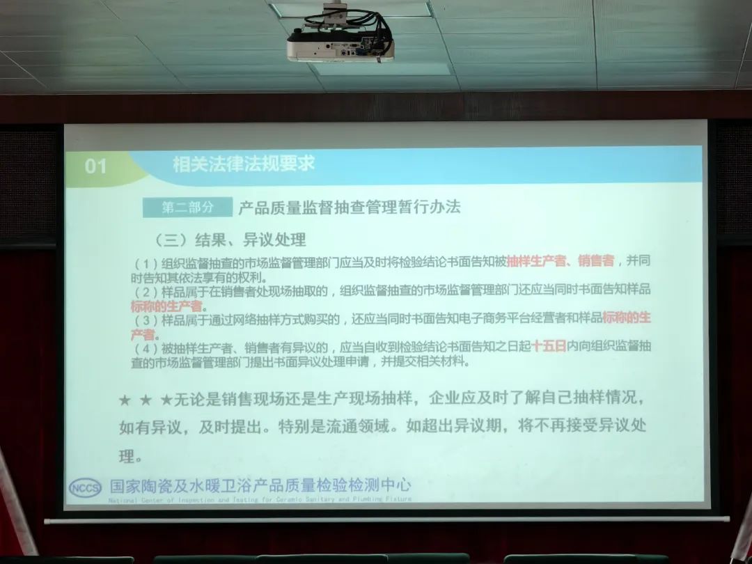 會議特別邀請了國家陶瓷及水暖衛(wèi)浴產(chǎn)品質(zhì)量檢驗檢測中心高級工程師楊志雄作為主講嘉賓,針對國家及省抽檢中常見的不合格項目及注意事項作了深入淺出、通俗易懂的培訓,得到與會企業(yè)代表的一致好評。