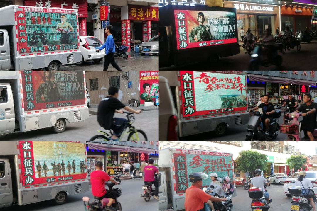二是充分利用超市、商業(yè)街等點位人流量大、位置顯著的優(yōu)勢,布置征兵宣傳車分階段開展巡邏式宣傳,同時懸掛征兵宣傳橫幅,通過車載廣播和醒目的宣傳標語,向過往群眾傳遞著征兵信息,大力營造濃厚的宣傳氛圍。