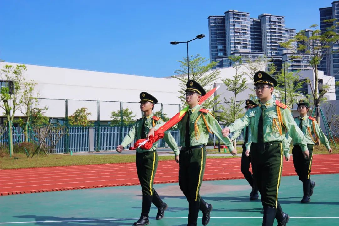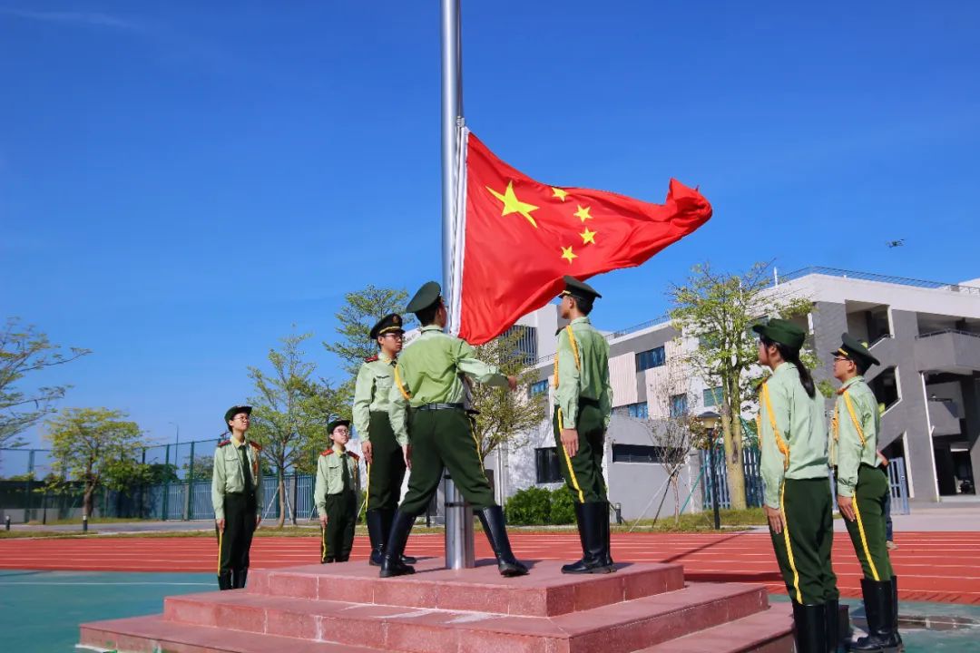上午9時整,迎著蓬勃而出的朝陽,升旗儀式正式開始。國旗護衛隊隊員邁著鏗鏘有力的步伐,昂首挺胸、精神抖擻,護衛著五星紅旗走至國旗臺前。