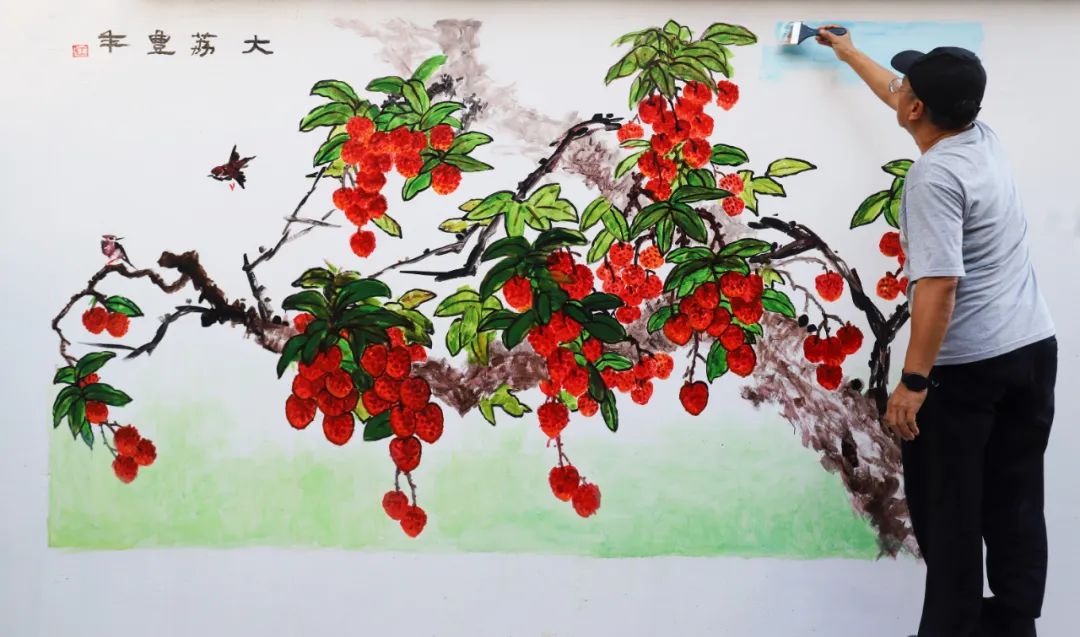 在“大荔豐年”圖中,只見串串鮮紅飽滿的荔枝掛滿枝頭,水靈晶瑩,色香誘人,形象生動。