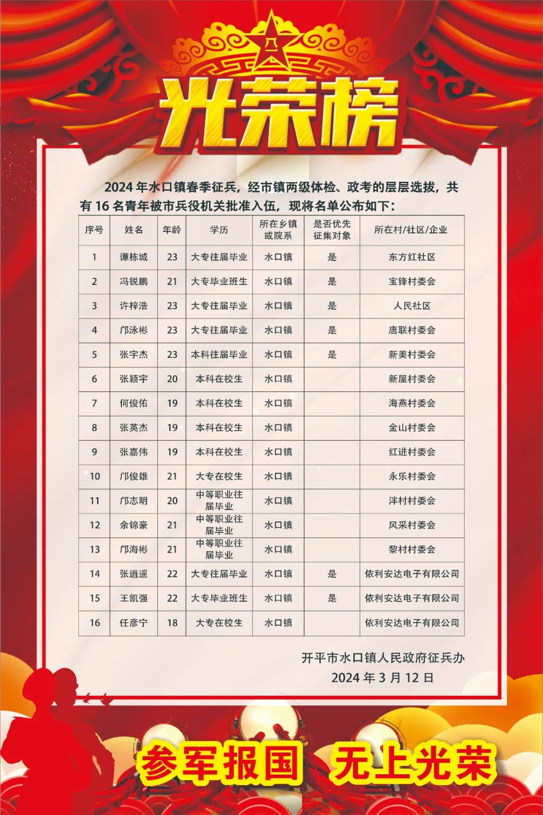 2024年春季16名熱血男兒光榮入伍!