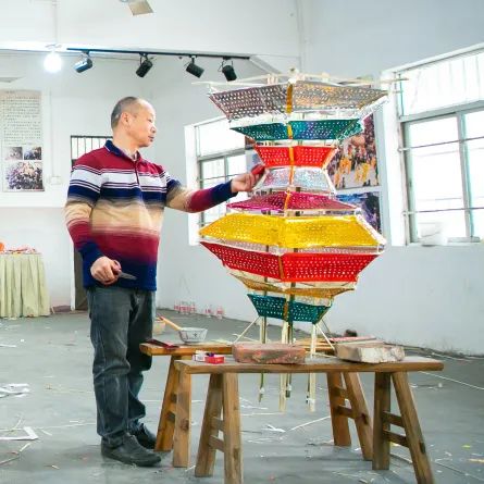 花燈制作是一項純手工的技藝,從選材到制作都非常講究。燈的規格大小、形式模樣,都有明確規定。花燈由燈芯、燈須、燈頭、燈肚、燈腳組成,重量約35斤。先用竹竿和竹篾扎制成框,用五色紙糊貼成形,再用金銀飾紙裝飾而成圖案瑰麗的彩燈。做花燈,最重要的就是耐心和細心。每一個細節都要處理得恰到好處,才能讓花燈既美觀又耐用。