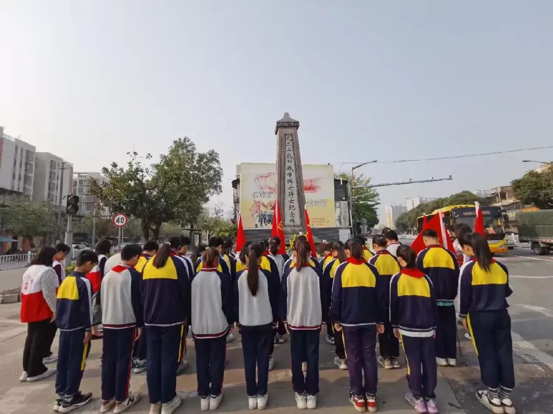 開平市沙岡初級中學師生代表攜手沙岡僑聯中心黨支部黨員,前往九二三抗日戰爭陣亡將士紀念碑,開展主題為“傳承紅色基因,緬懷革命先烈”的祭掃活動,全體人員高唱國歌,向革命烈士紀念碑敬獻花籃,并脫帽默哀,深切表達對革命先烈的追思與敬意。隨后,同學們前往沙岡僑聯中心參觀學習,深入了解沙岡地區的歷史變遷,進一步激發學生的愛國熱情和愛鄉情懷。